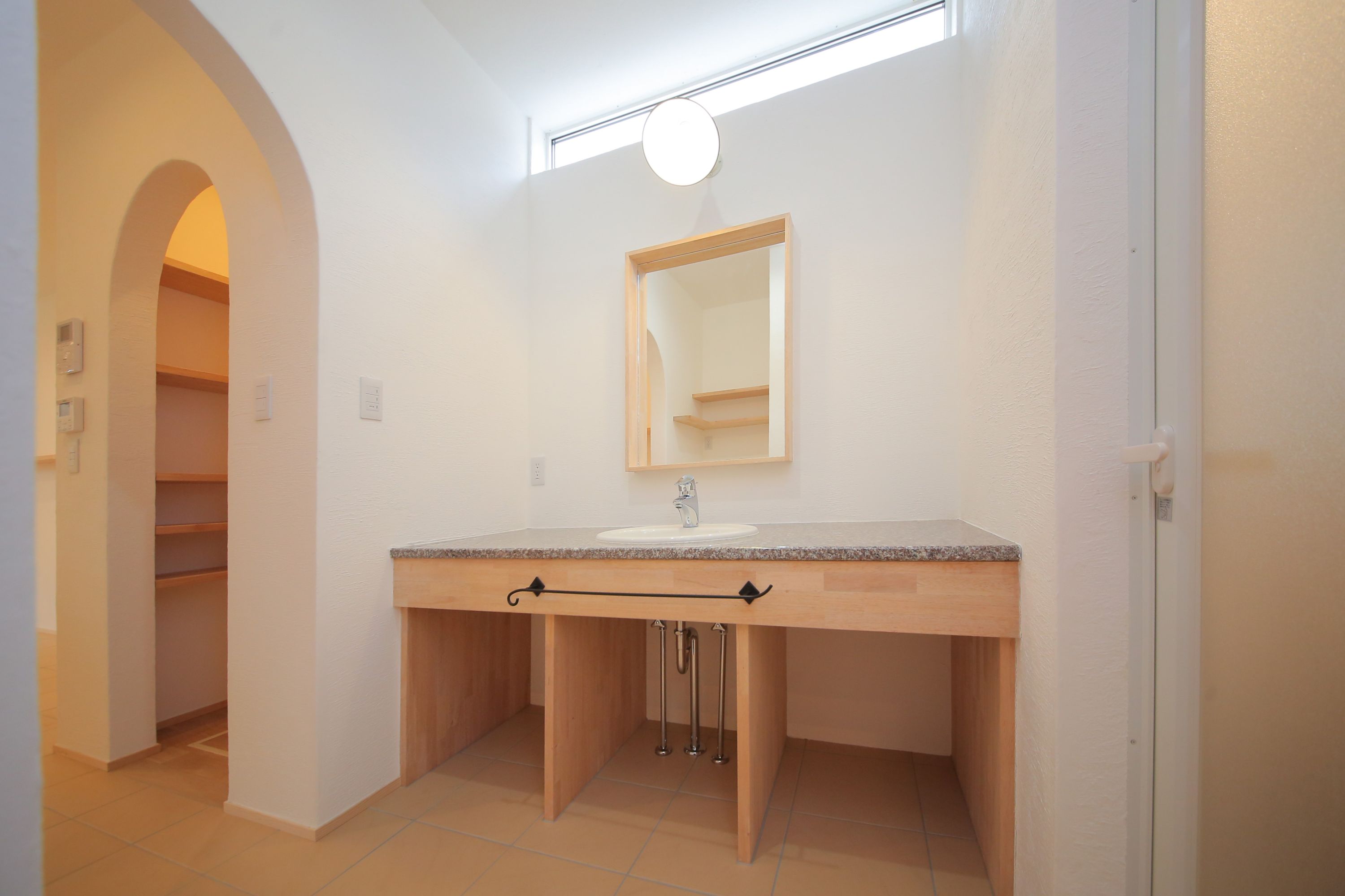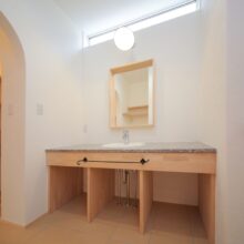 洗面台もキッチンと同様に、天然石の天板と無垢材で仕上げたオーダーメイド。扉や棚をあえて設けないシンプルなデザインは、素材の美しさを際立たせ、使い勝手の良さを追求しました。高窓からの自然光が、清潔感あふれる空間を明るく照らします。