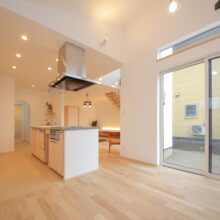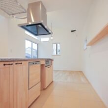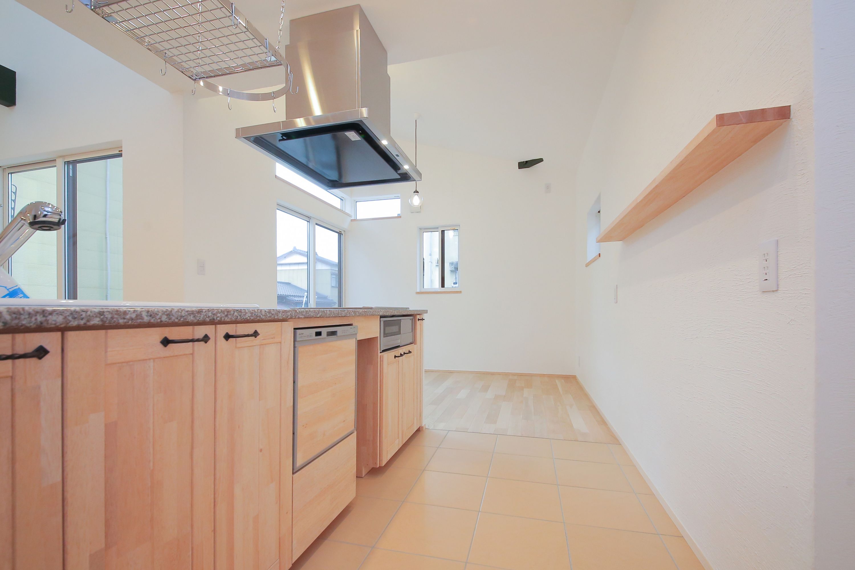 無添加住宅オリジナルの石天板と無垢材で丁寧に造り上げられたアイランドキッチンは、その美しい佇まいはもちろん、使いやすさも抜群。開放的な空間で、家族や友人との会話を楽しみながらお料理できます。