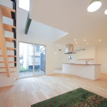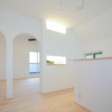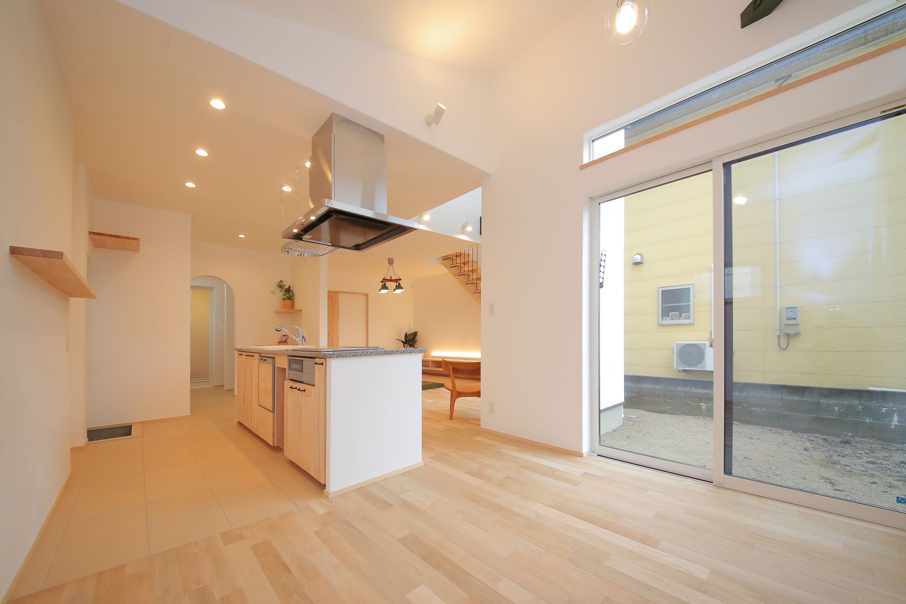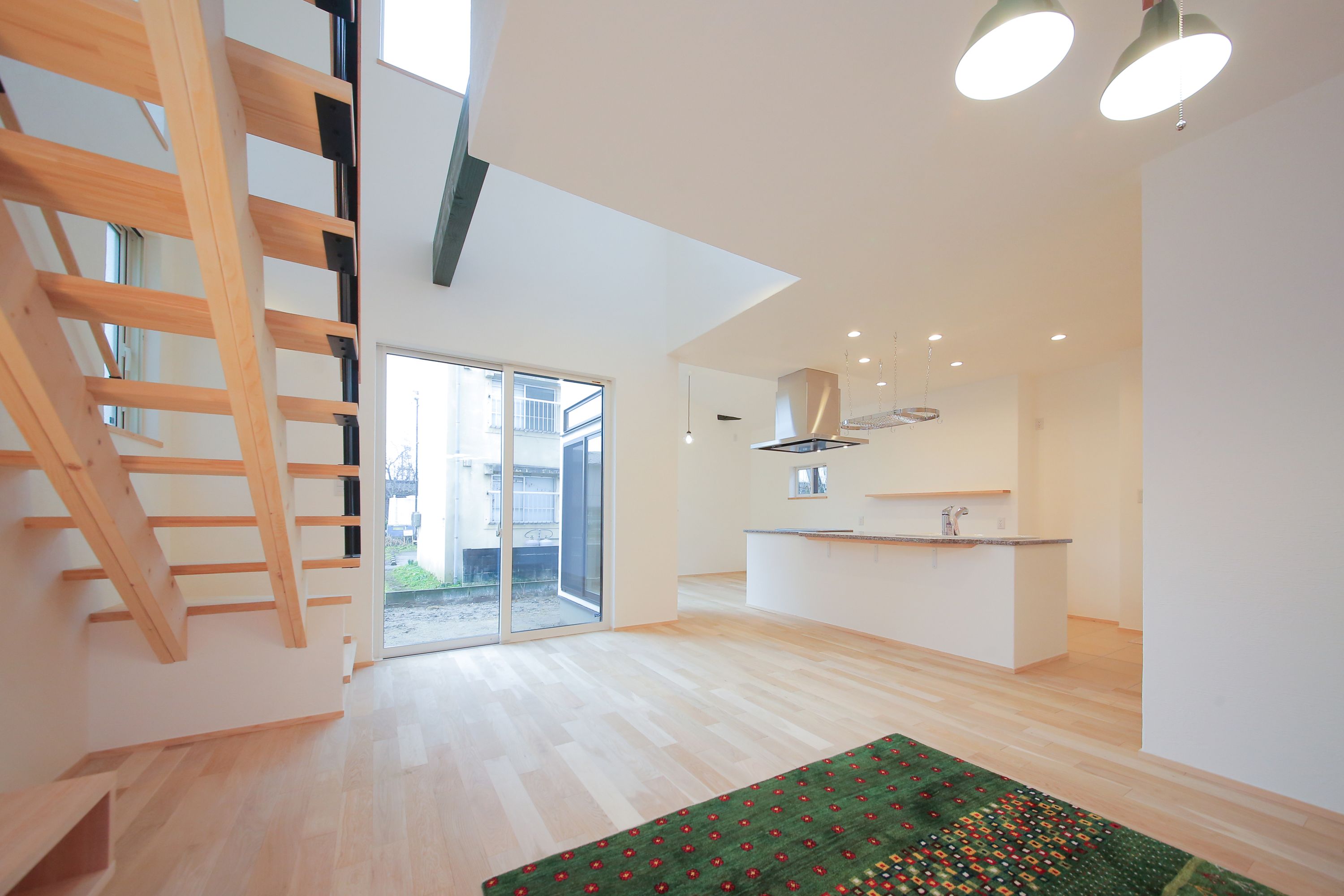 家の中心となるLDKは、L字型の設計と吹き抜け、計算された窓配置により、一日中明るい光で満たされます。無垢材の床や梁が心地よい安らぎをもたらし、家族の笑顔が自然と集まる空間です。