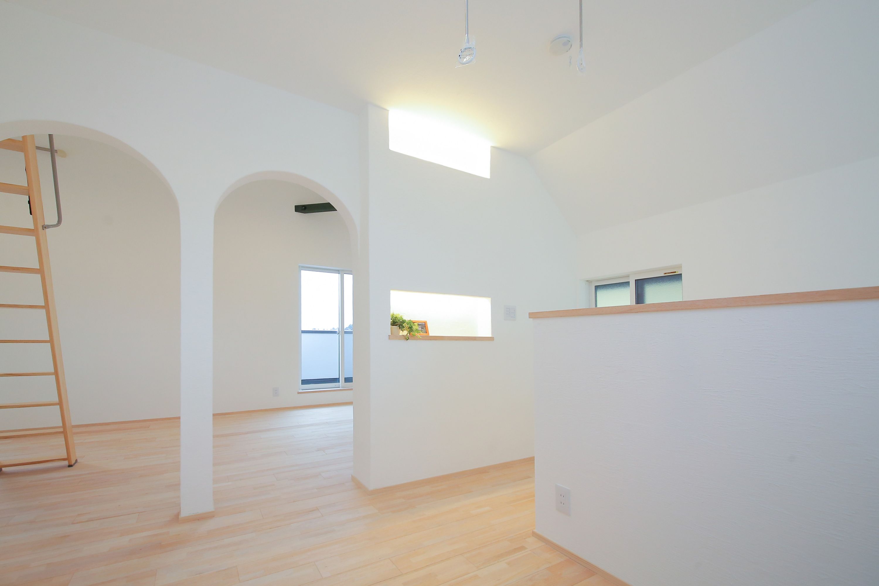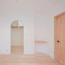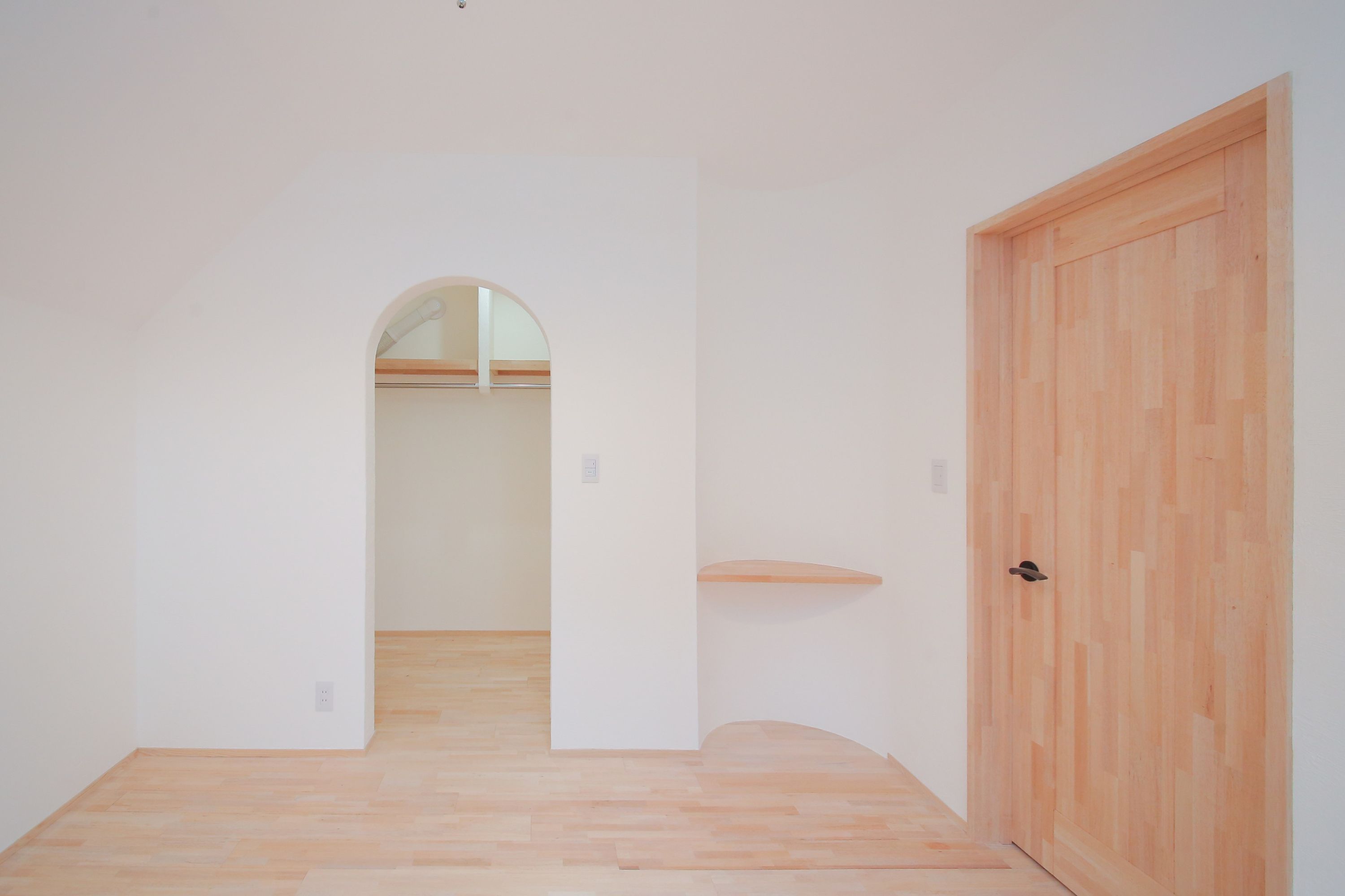 主寝室の壁面には、半円を描く優雅な飾り棚を設置。アーチ状にデザインされたウォークインクローゼットの入り口が、空間全体に優しい雰囲気をもたらします。