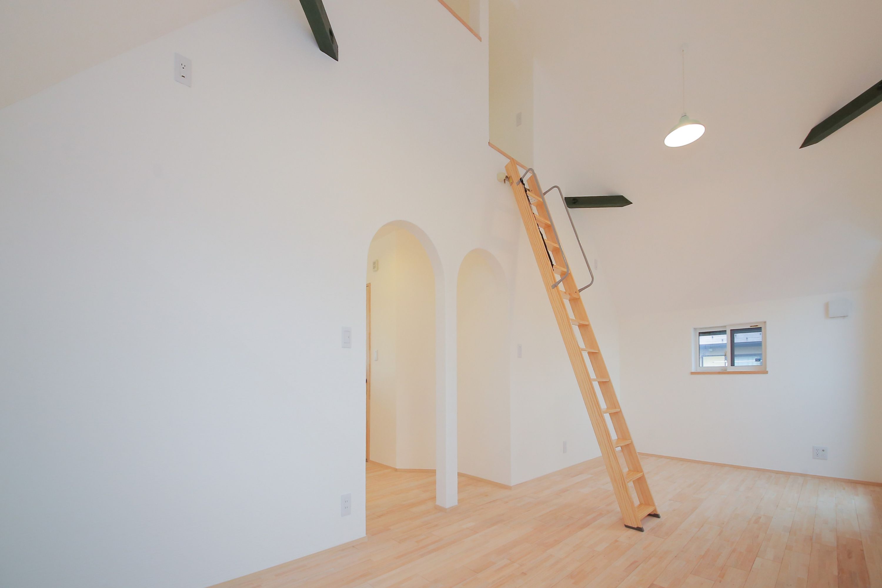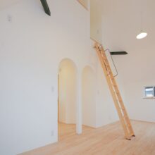 お子様の成長に合わせて間仕切り可能な子ども部屋。アクセントとなるグリーンに塗装された火打ち梁が、空間に遊び心をプラス。そして、お子様の冒険心をくすぐる、秘密基地のようなワクワクする小屋裏空間もご用意しました。