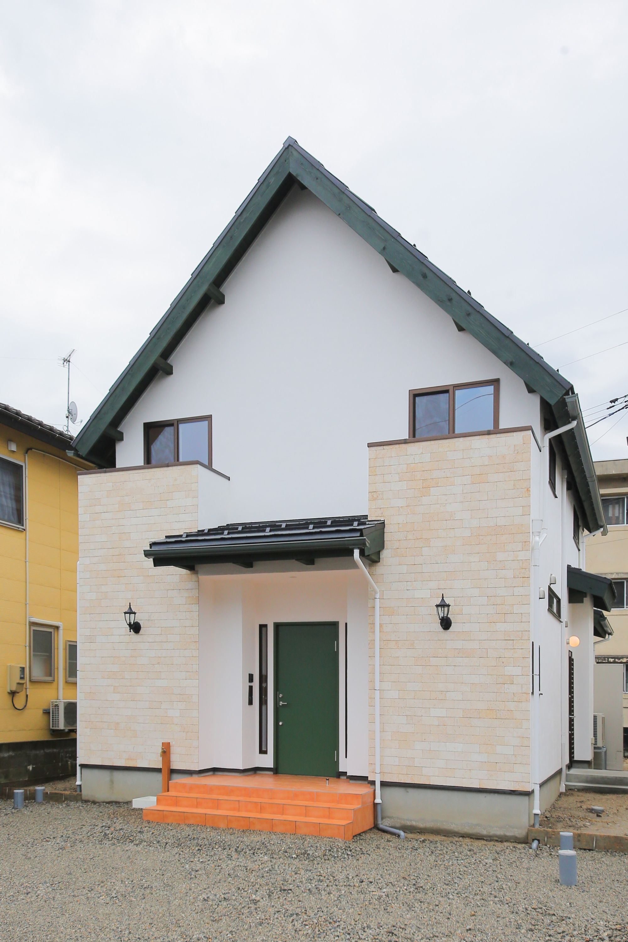 天然石の屋根と漆喰の白壁が織りなす外観は、自然素材ならではの温かみと風格が漂います。正面にあしらわれたコーラルストーン(珊瑚の化石)が唯一無二の表情をプラス。グリーンの破風板と玄関ドア、三角屋根がアクセントとなり、訪れる人を優しく迎え入れます。