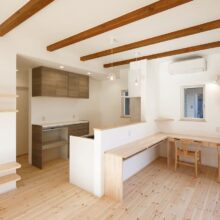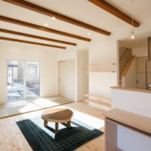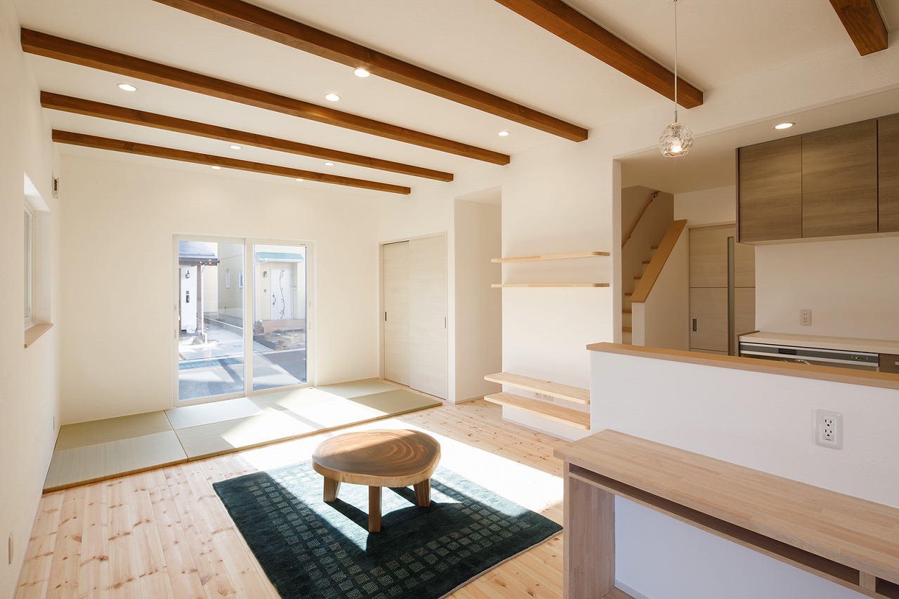 リビングは、漆喰壁の柔らかな白と、パイン材の明るい床のコントラストが、開放的で明るい空間を演出。大きな窓からはたっぷりの自然光が注ぎ込み、室内を明るく照らします。リビングの一角は、置き畳コーナーに。子供たちの遊び場やお昼寝スペースとしてはもちろん、来客時には客間としても活用できます。畳を片付ければ、広々としたリビング空間として使え、フレキシブルな空間利用が可能です。