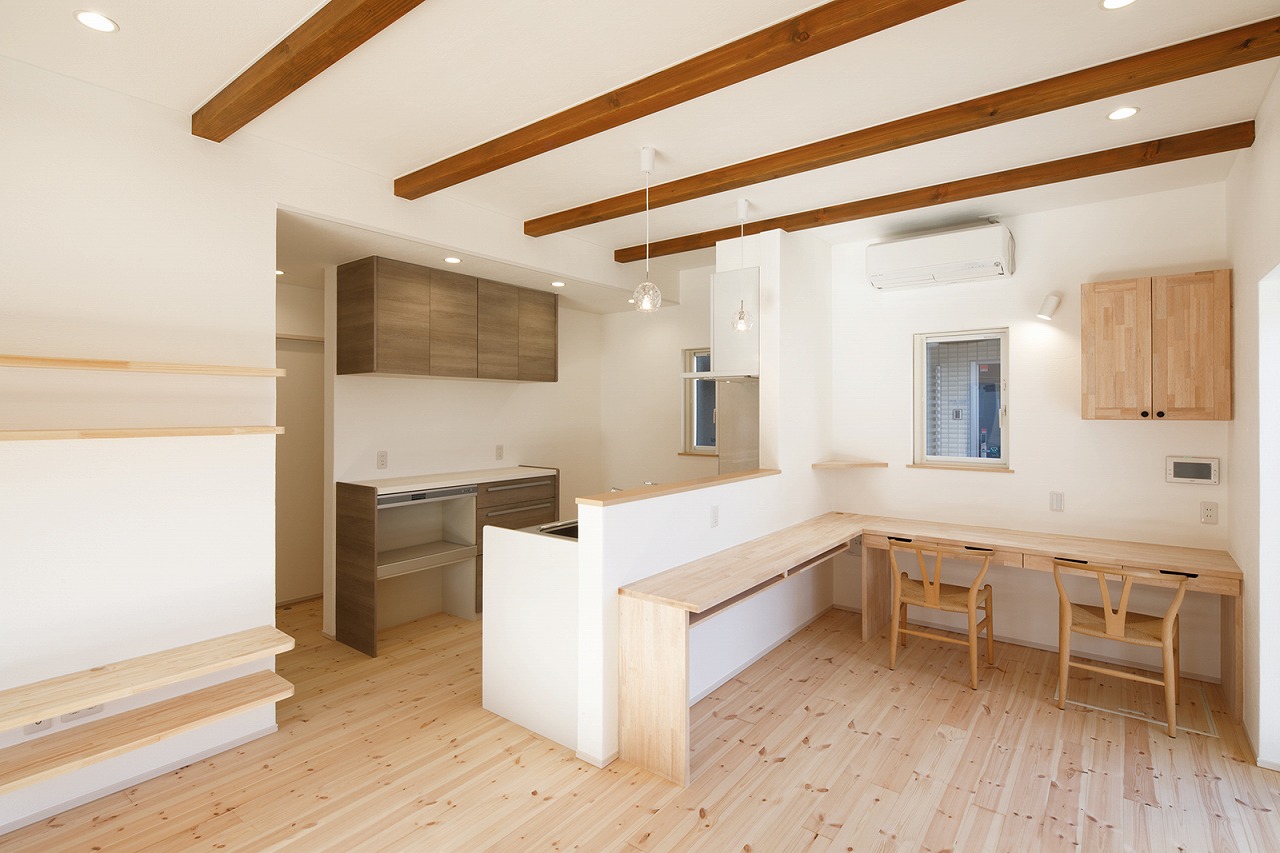 キッチンは、使いやすい二の字型。対面にはスタディーカウンターを造作。引き出しには文房具や書類を収納でき、子供たちの学習スペースや、在宅ワークにも最適です。