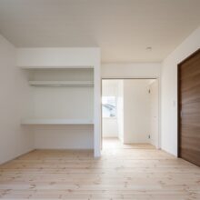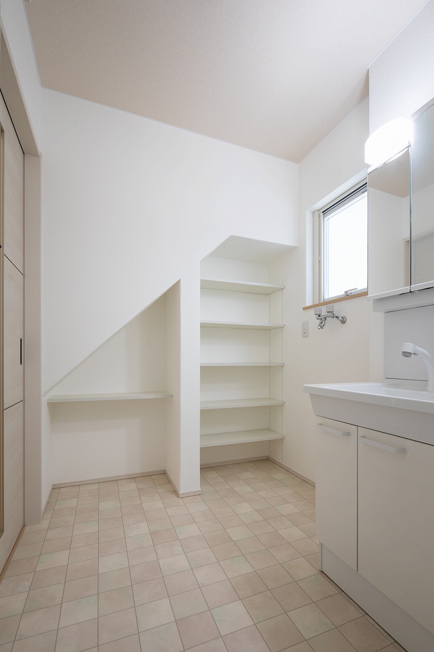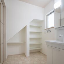 洗面脱衣室は、階段下のデッドスペースを有効活用した収納棚を設置。タオルや着替え、洗剤などをスッキリ収納できます。2階にも洗濯機置き場とウォークインクローゼットを設け、ホールには室内干し用のスペースを確保。洗濯から乾燥、収納までを2階で完結できる、家事ラク動線を実現しました。