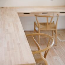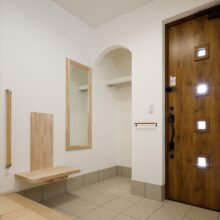 玄関を開けると、パイン材の無垢床が素足に心地よい温もりを伝えます。広々とした玄関には、家族が並んで靴を履けるゆとりがあり、壁に設置された無垢材シンゴンの造作ベンチは、靴の脱ぎ履きはもちろん、ちょっとした荷物置きに便利。姿見はベンチと同様のシンゴンで枠組みし、統一感を持たせました。