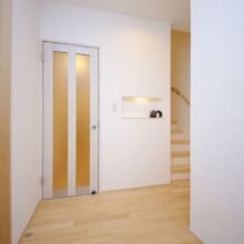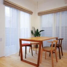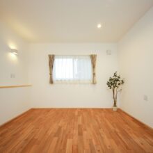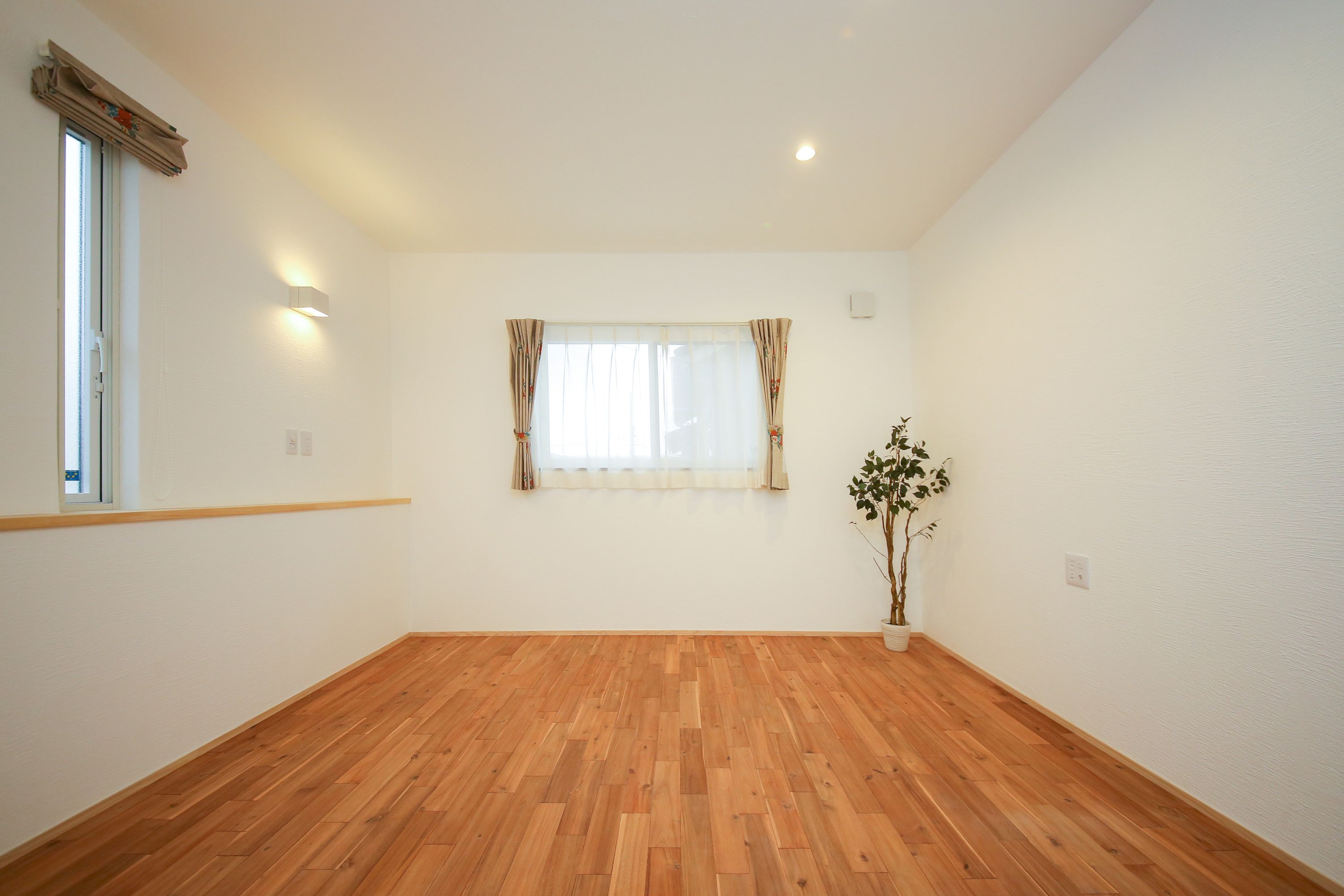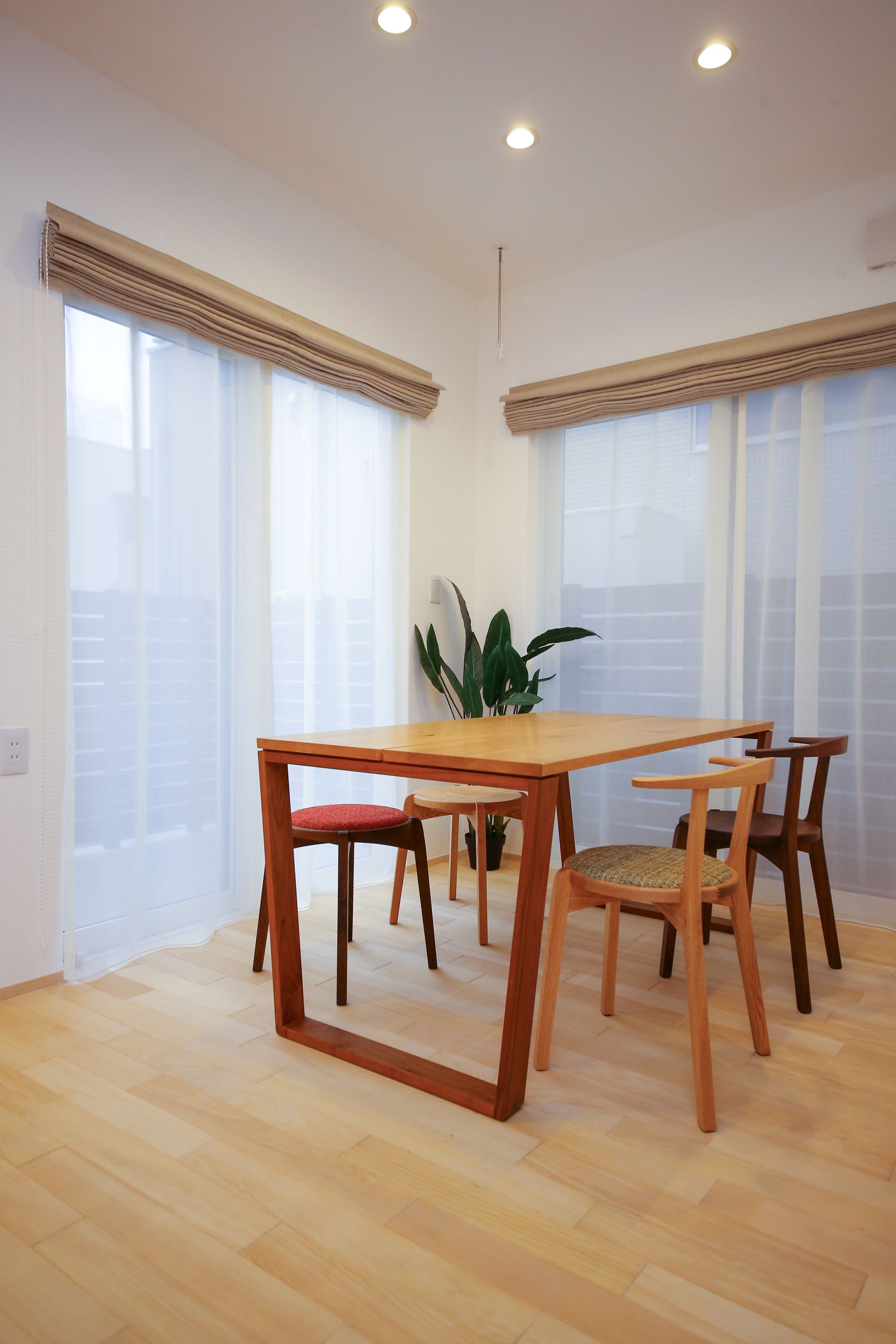1階の床材には、やわらかな木目と上品な色合いが特徴のインドネシア松を使用。2階は柿渋塗装を施したアカシアを使用し、空間ごとに異なる表情を演出しました。自然素材に囲まれた、家族の笑顔があふれる住まいです。