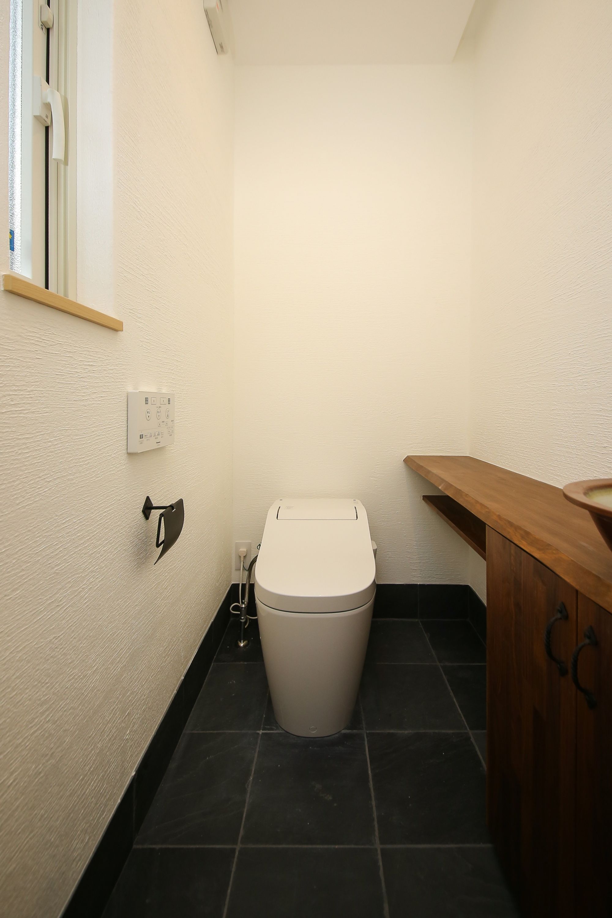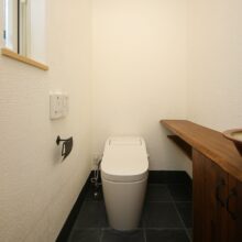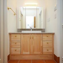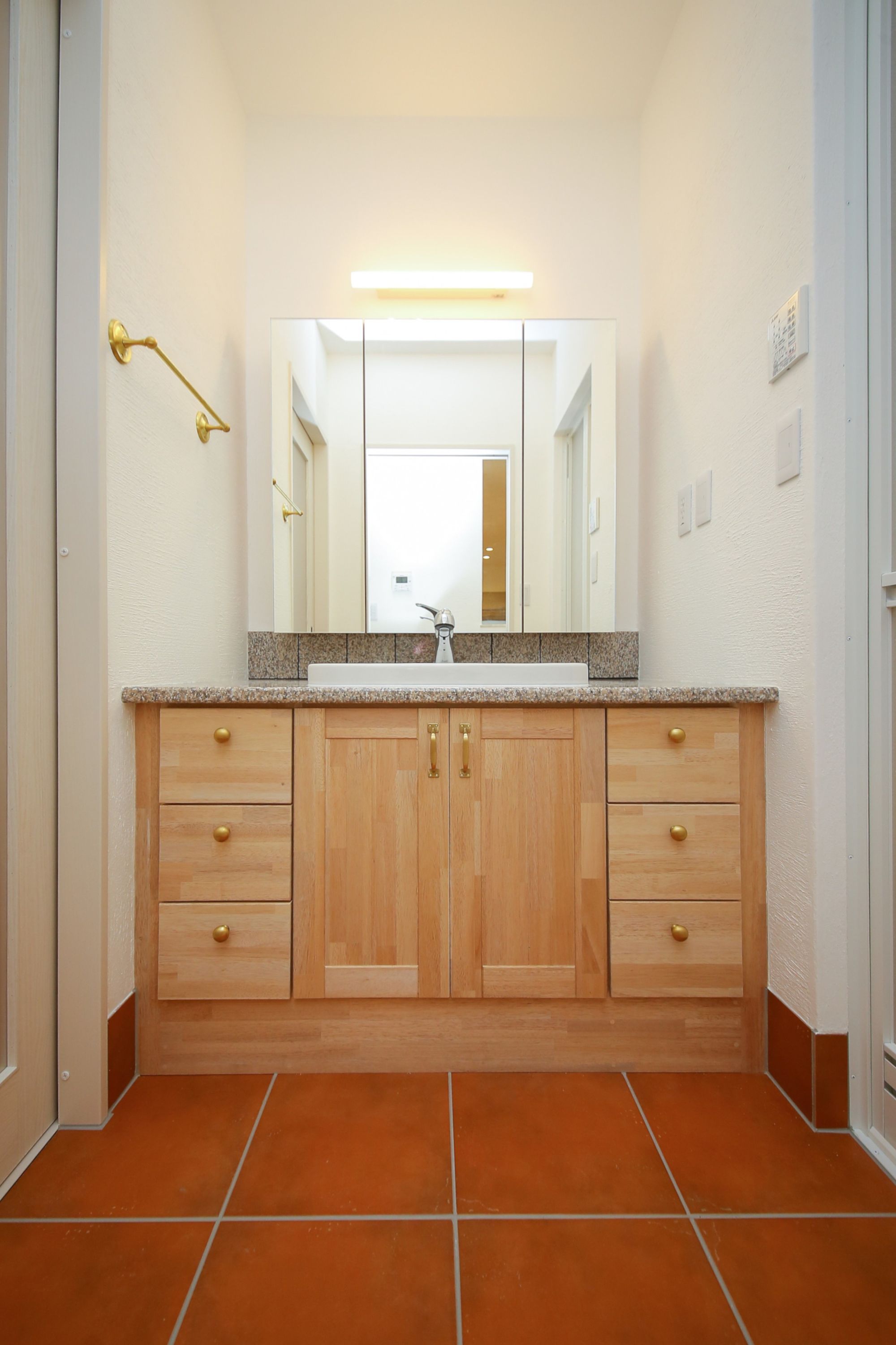 対面キッチンからはリビングの様子が一望でき、お子様の姿を見守りながら家事ができるので安心です。洗面化粧台は無添加住宅オリジナルのオーダーメイド。天然石の天板は水に強く、お手入れも簡単です。