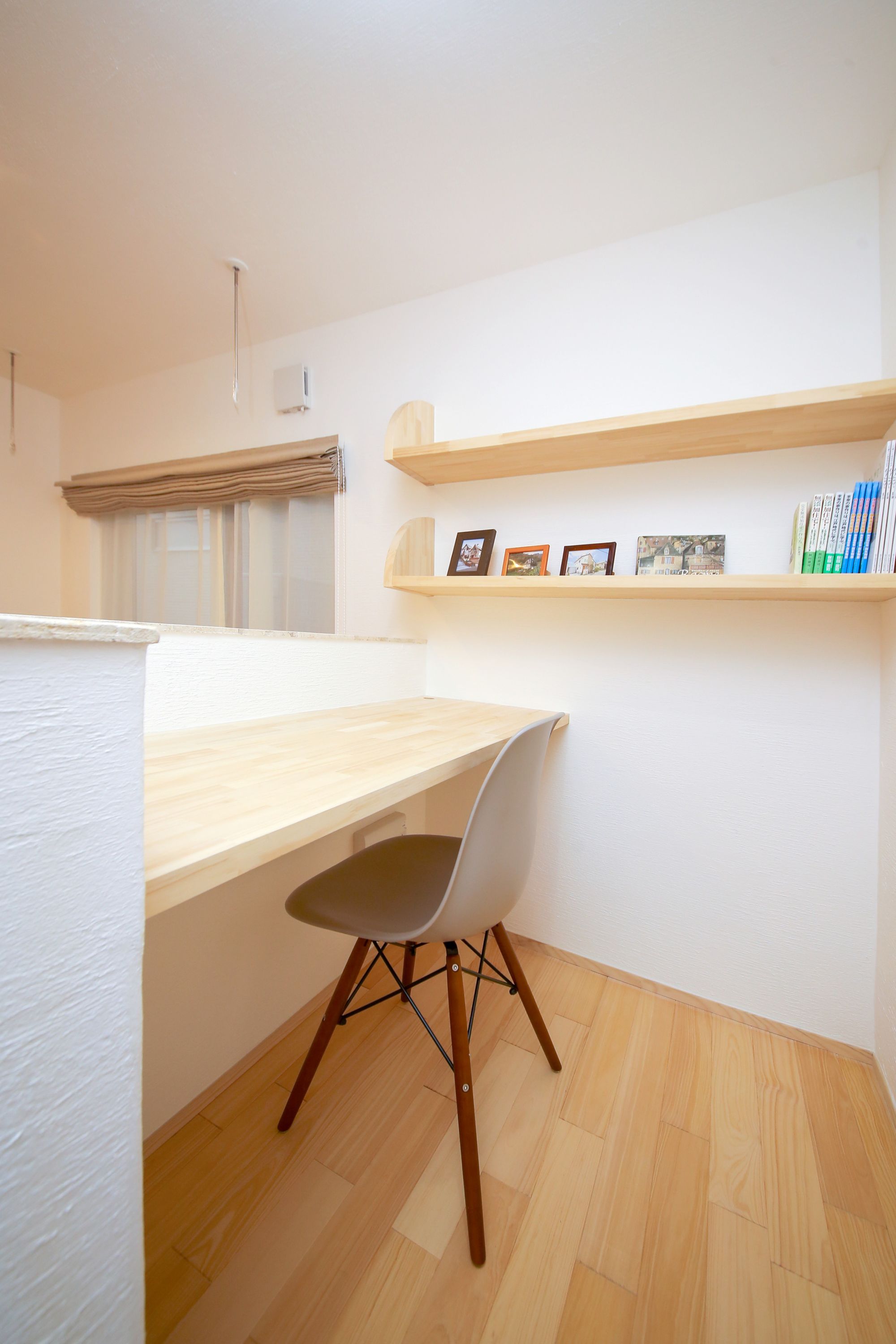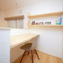 ダイニング奥にはLDK全体を見渡せるPCスペースを設けました。同じ空間にいるご家族との繋がりを感じつつ、安心して作業に集中できます。リビングとダイニングに面したタイルテラスは、お子様とのプール遊びや愛犬との触れ合いなど、様々な用途で活用できる多目的スペースです。