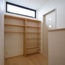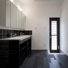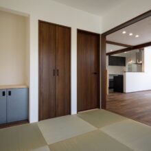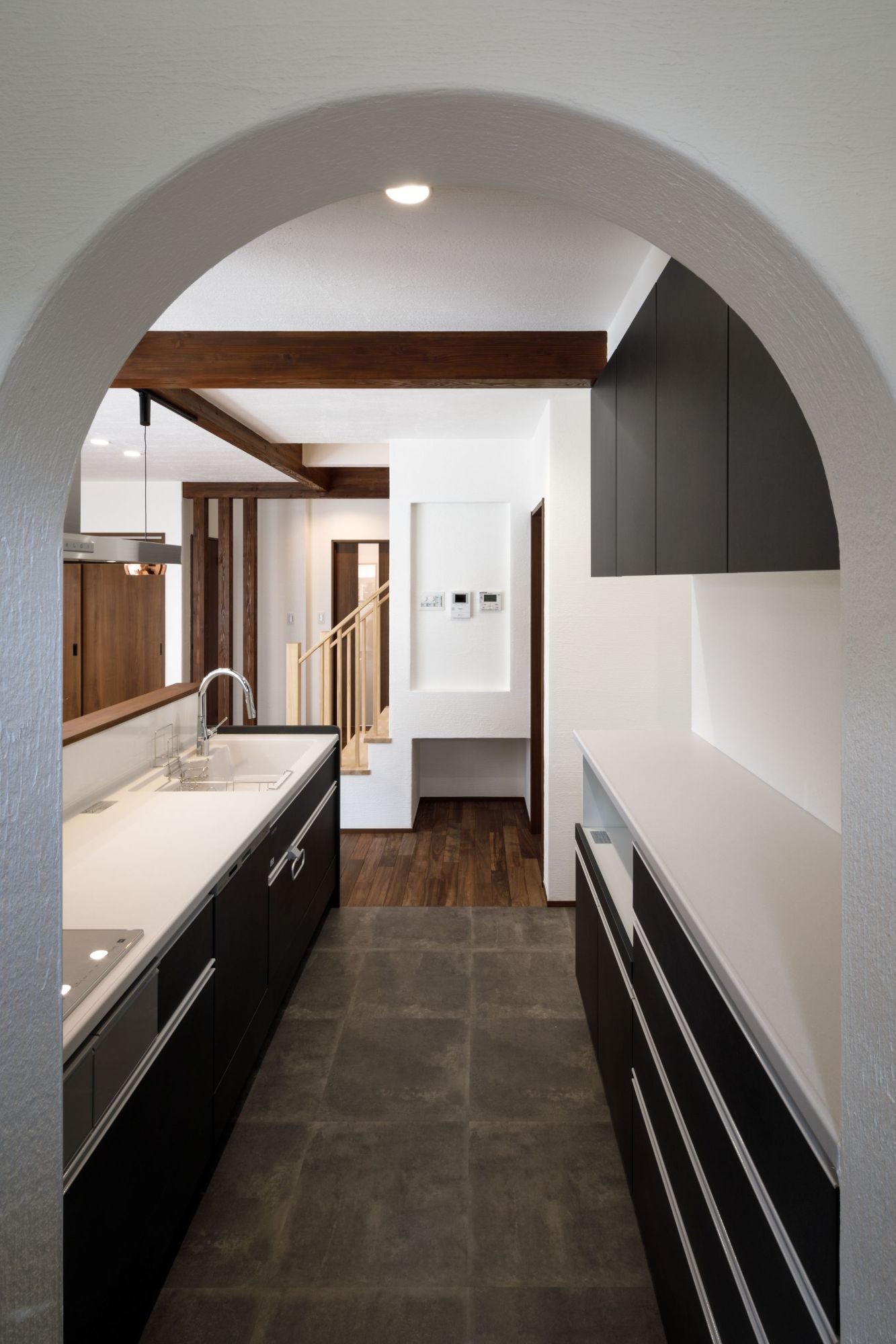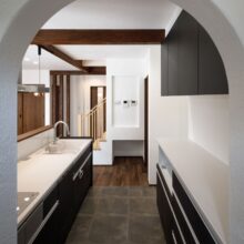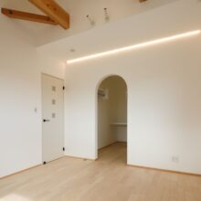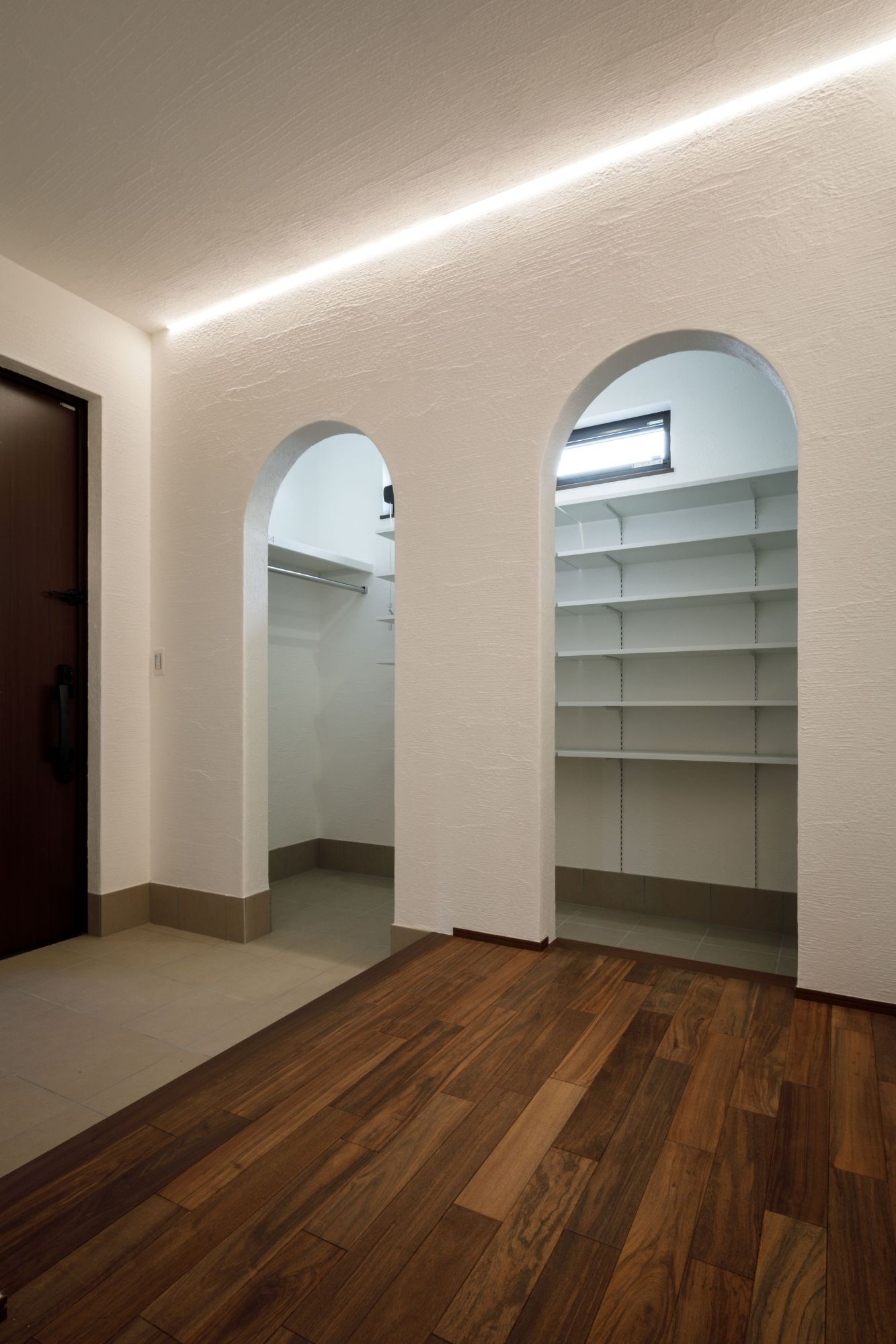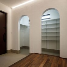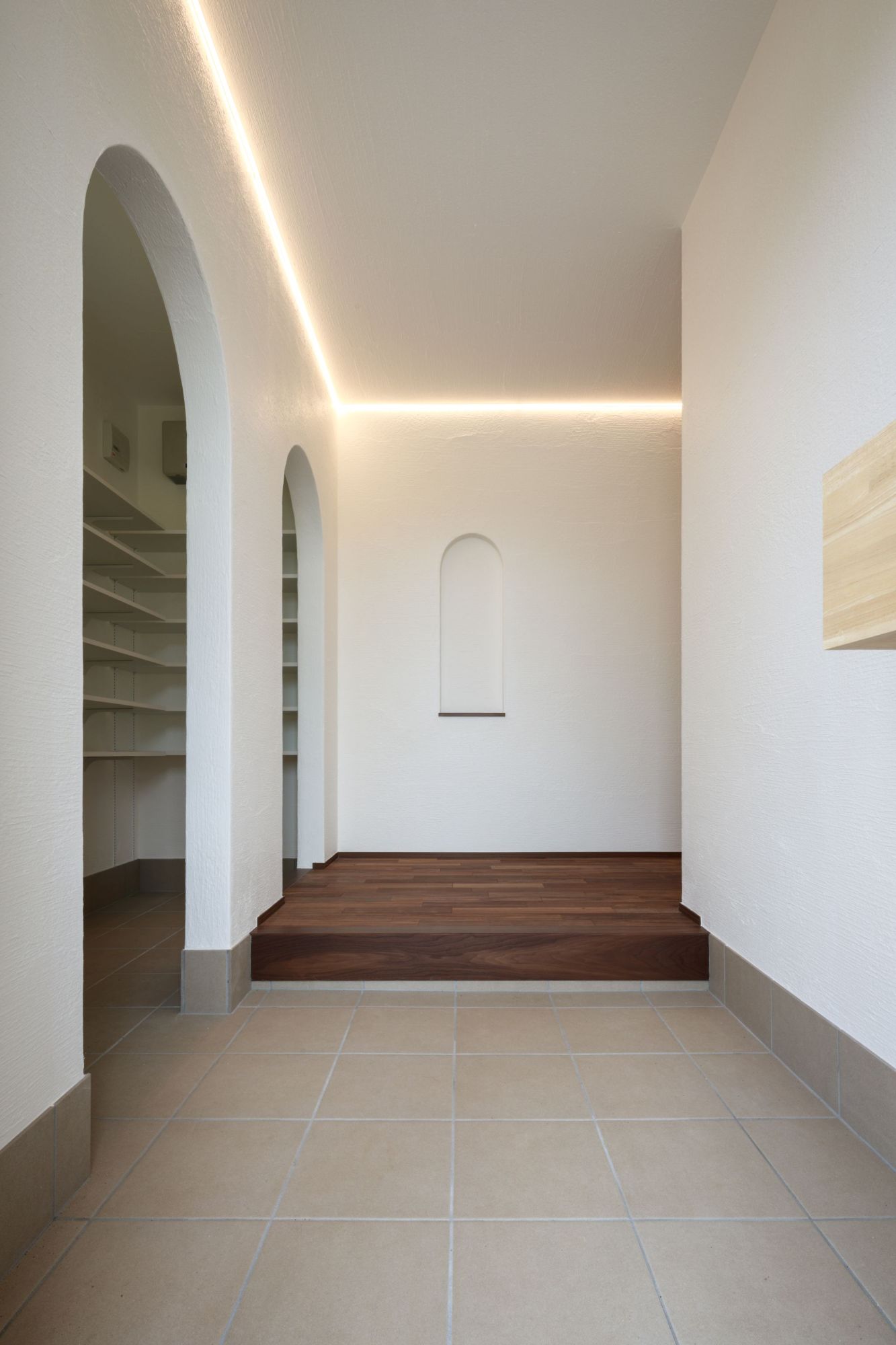 アーチ状の優美な垂れ壁(R壁)が光と影の美しいコントラストを生み出し、お客さまを温かく迎え入れます。床には重厚感のある無垢フローリング(ロックファー)を採用し、上質で落ち着いた雰囲気を演出しました。