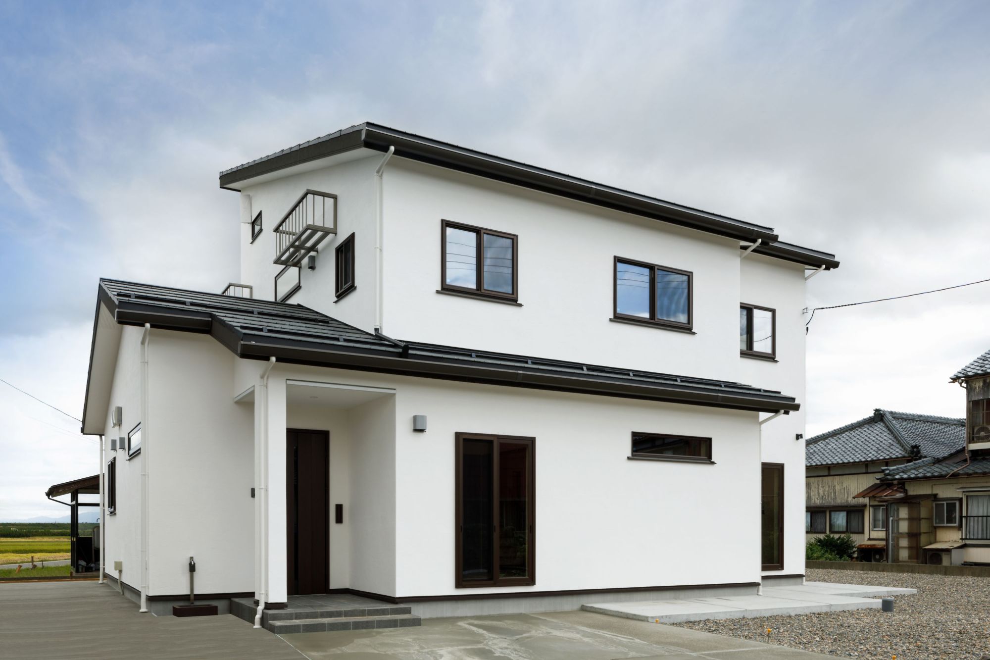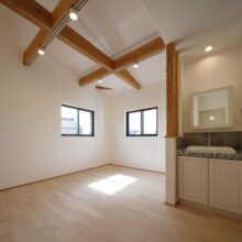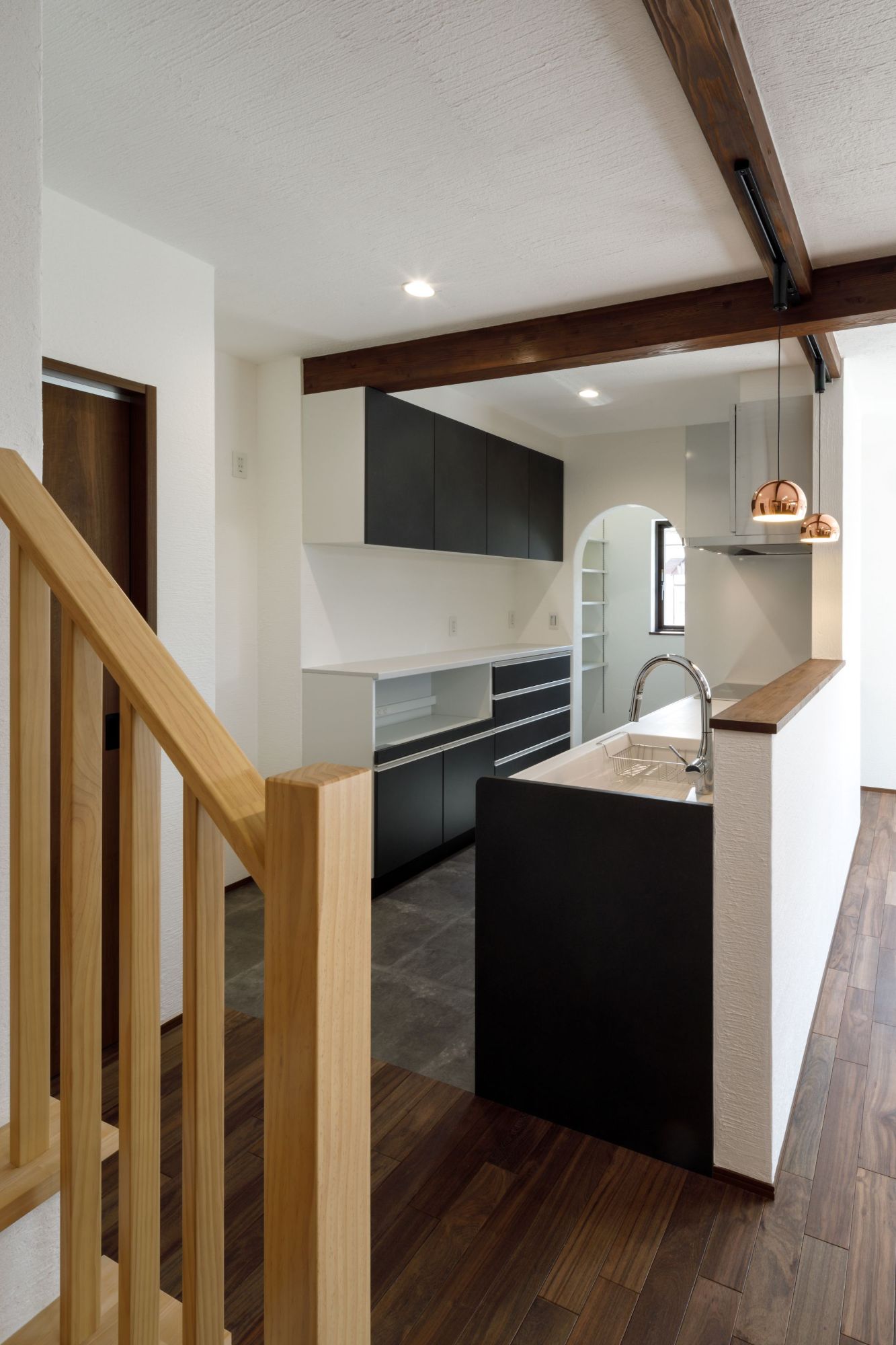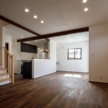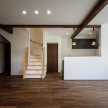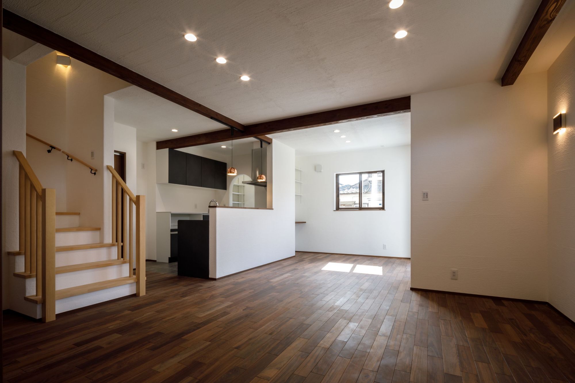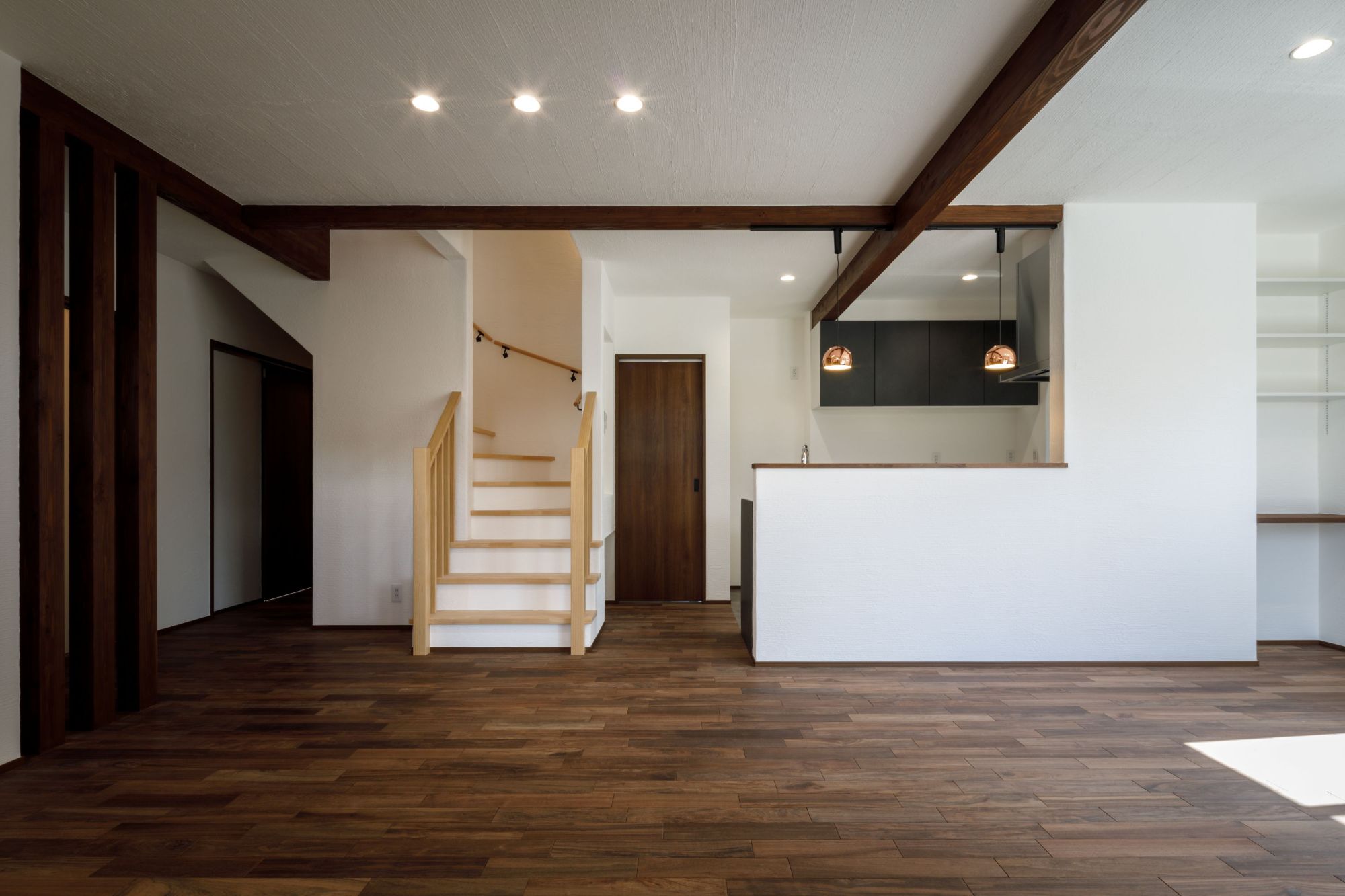 家族が集うLDKは、梁見せ天井が開放的な大空間。キッチンカウンターの上にはペンダントライトを吊るし、カフェのような心地よい空間に仕上げました。