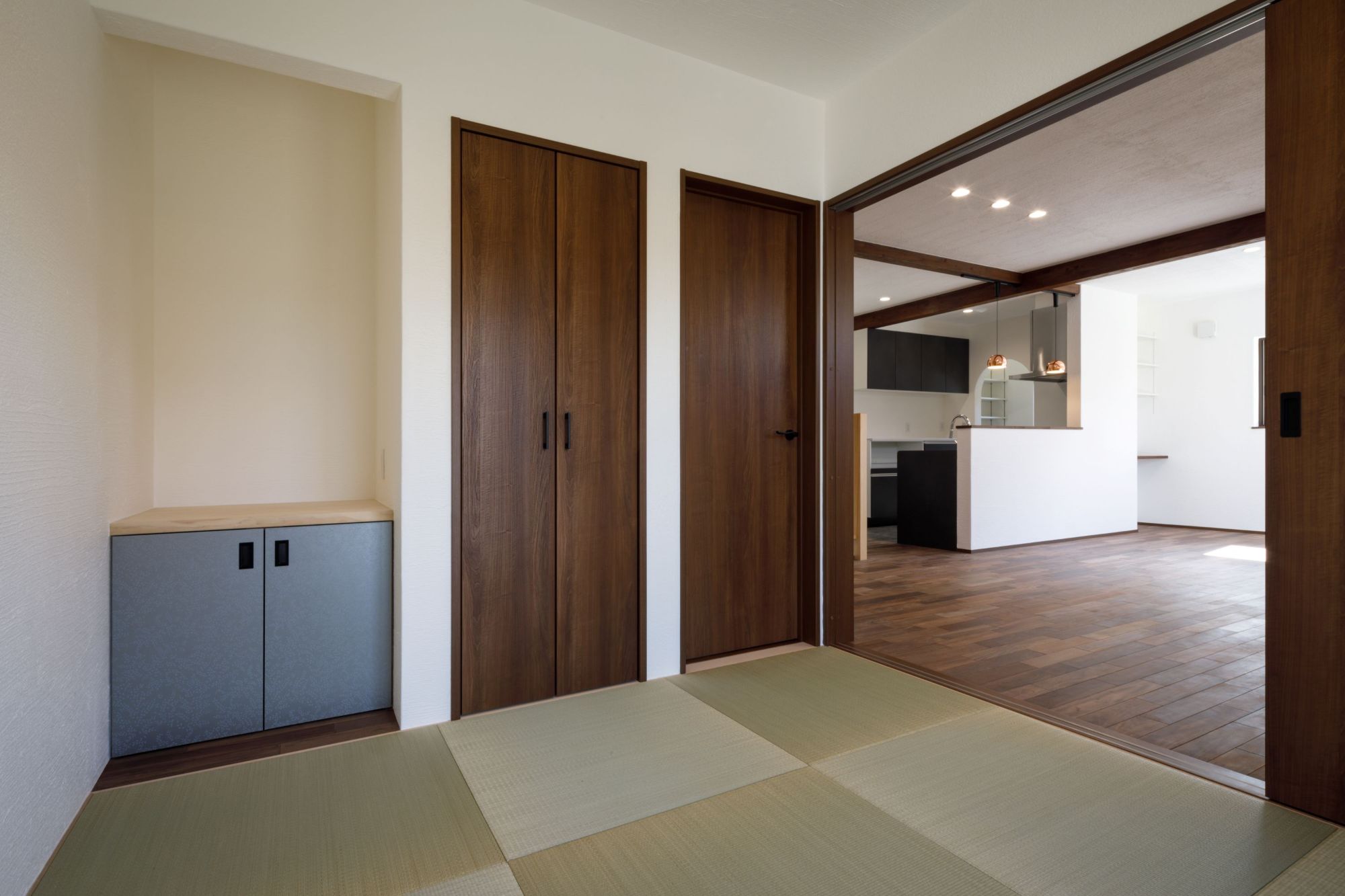 天井や壁を照らす柔らかな光が、無垢材や漆喰の豊かな表情を引き立てる。計算され尽くした照明計画で、日々の暮らしを上質に彩る住まいが完成しました。ただ明るくするだけではない「光のデザイン」が、空間に奥行きと温かみ、そして安らぎをもたらしています。