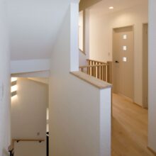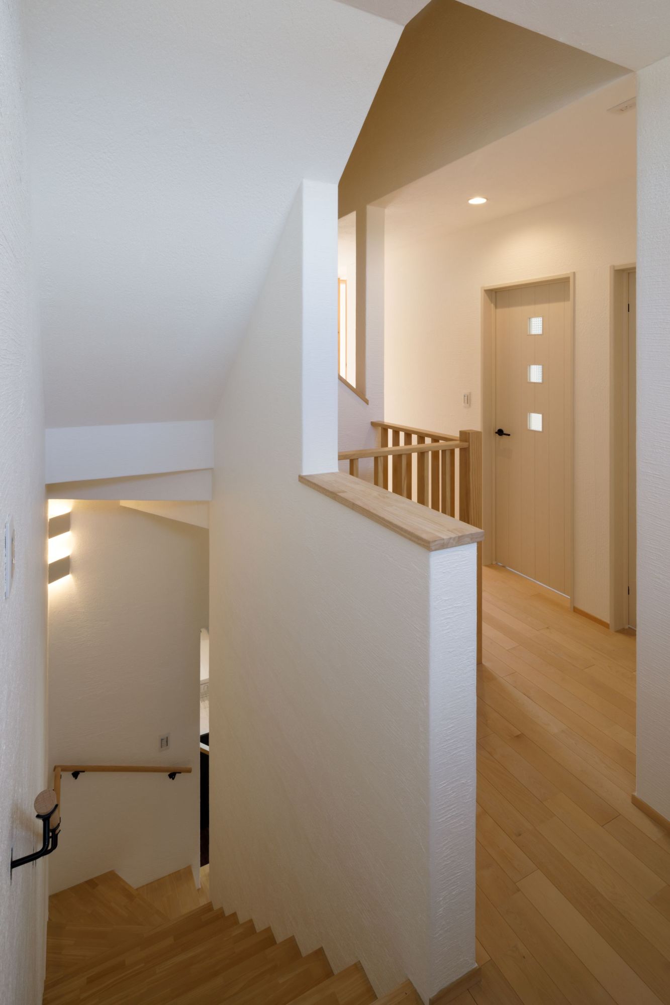 ブラケットライトが優しく照らす階段は、光によってコテ跡の豊かなテクスチャーが浮かび上がり、まるで一枚の絵画のよう。日々の暮らしの中に、心豊かな時間をもたらしてくれます。