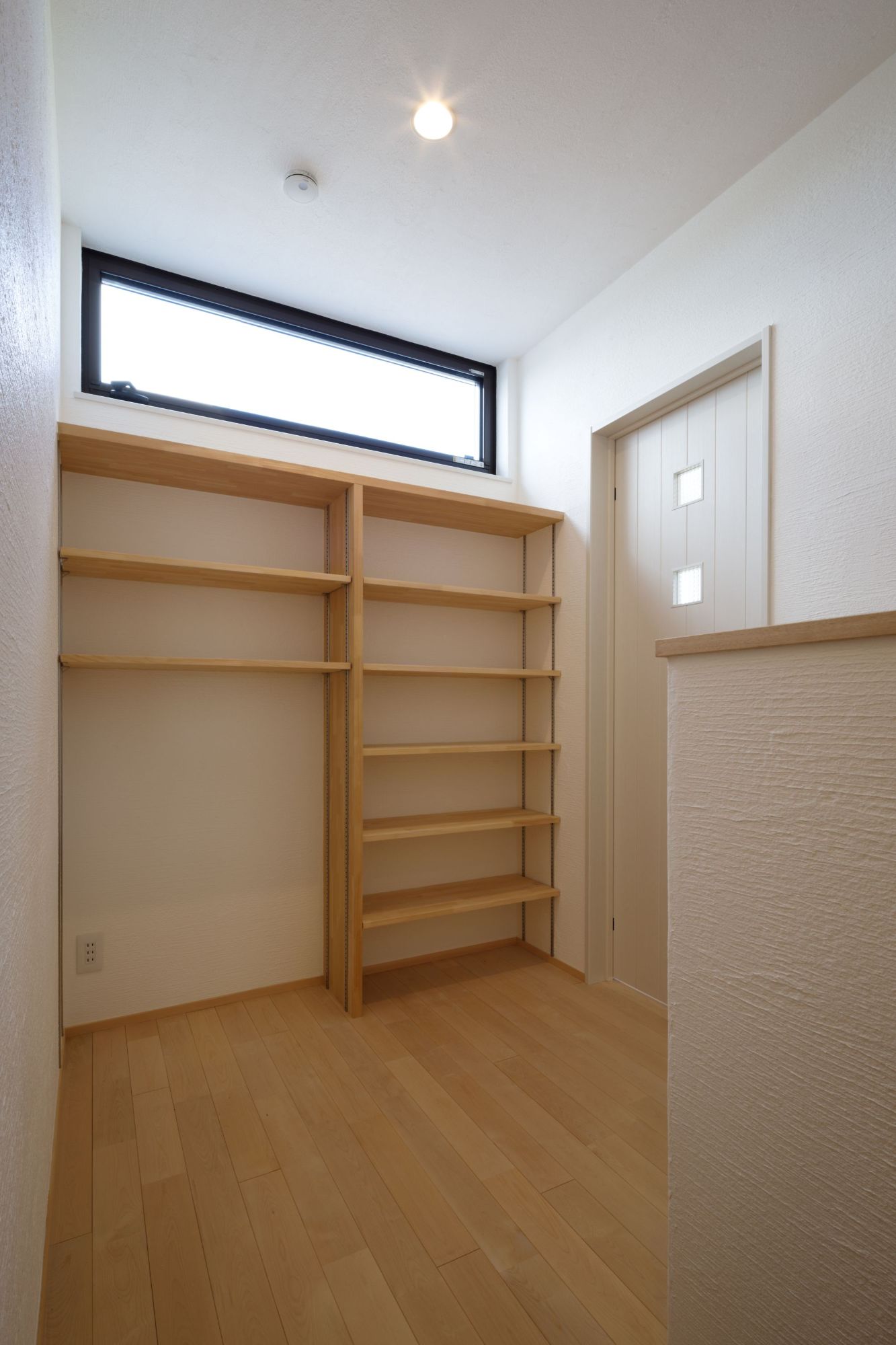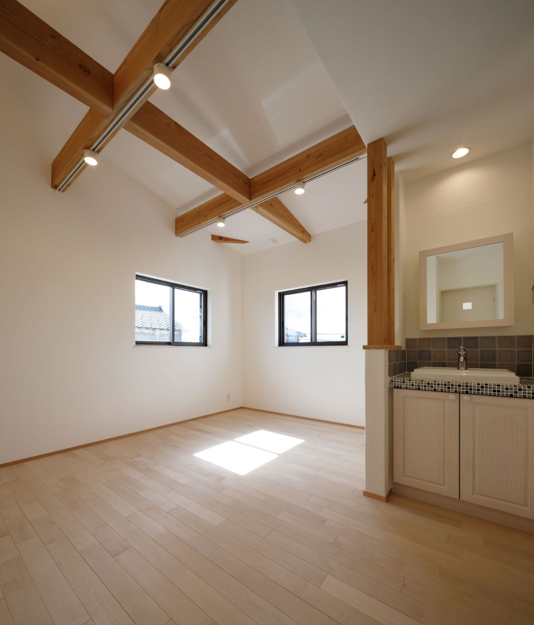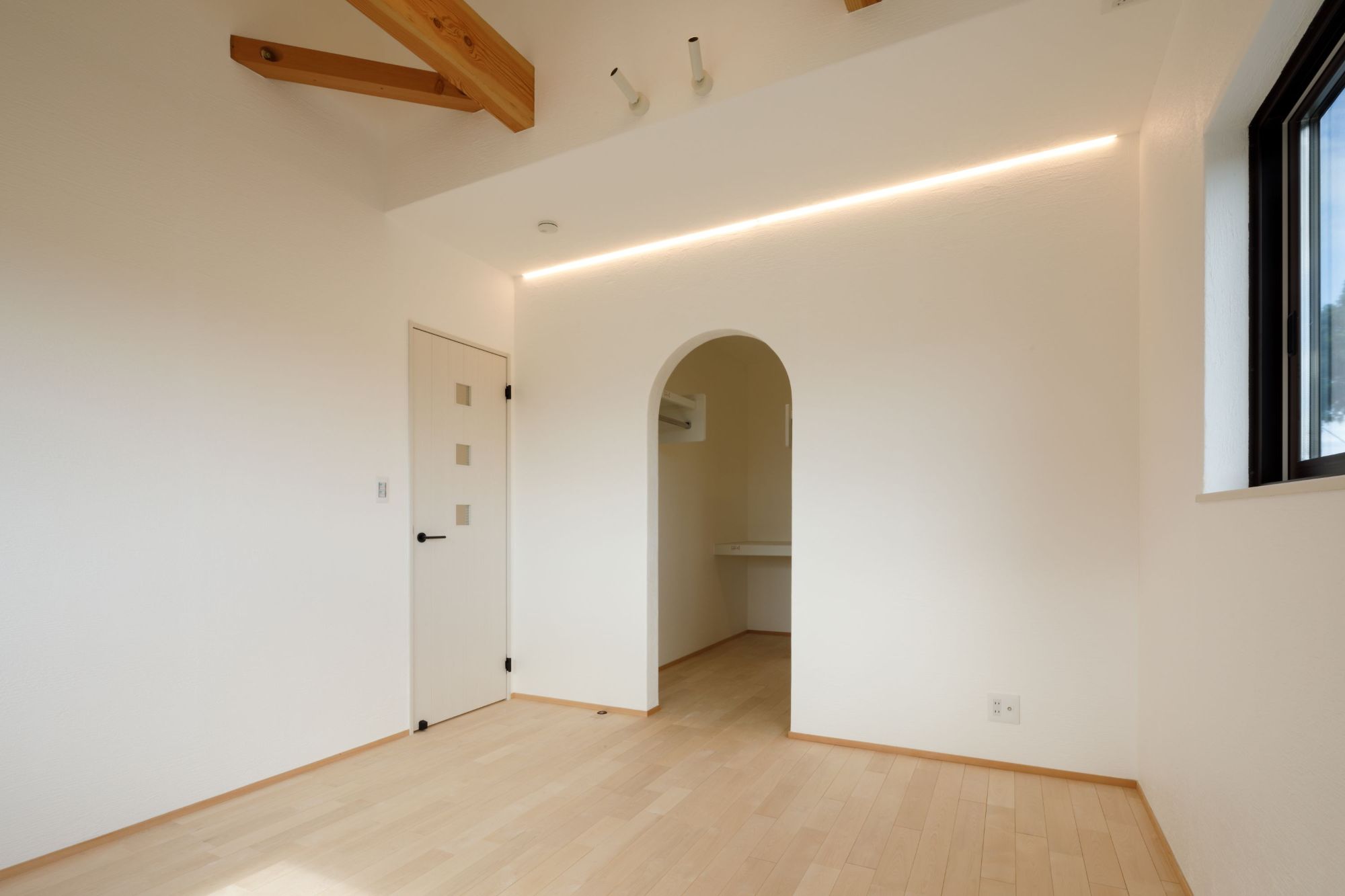 2階のセカンドリビングや居室は、勾配天井を活かした伸びやかな空間が広がります。ここでも天井にライン状の間接照明を採用。斜めの天井に沿って伸びる光が、空間にさらなる奥行きと開放感をもたらします。