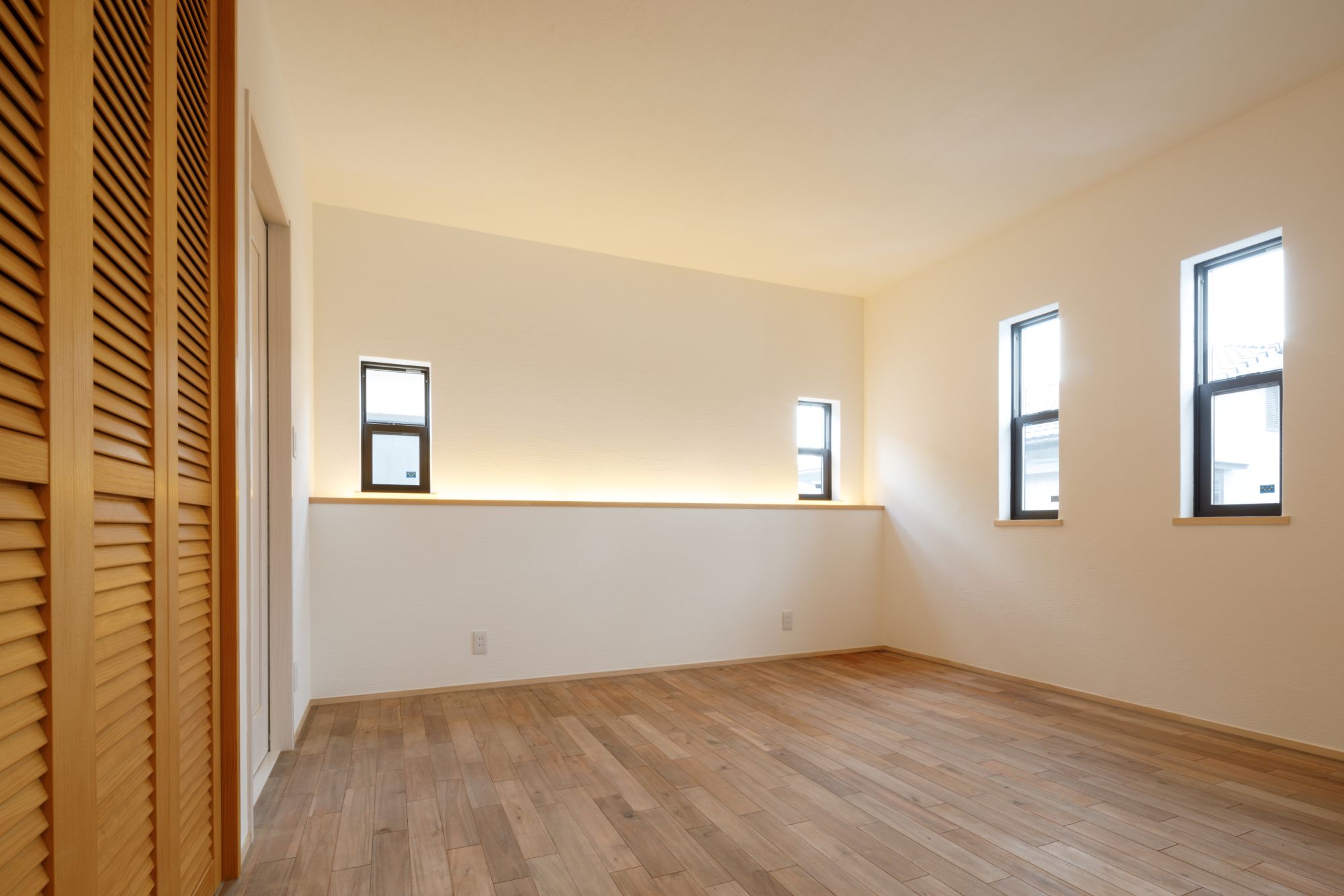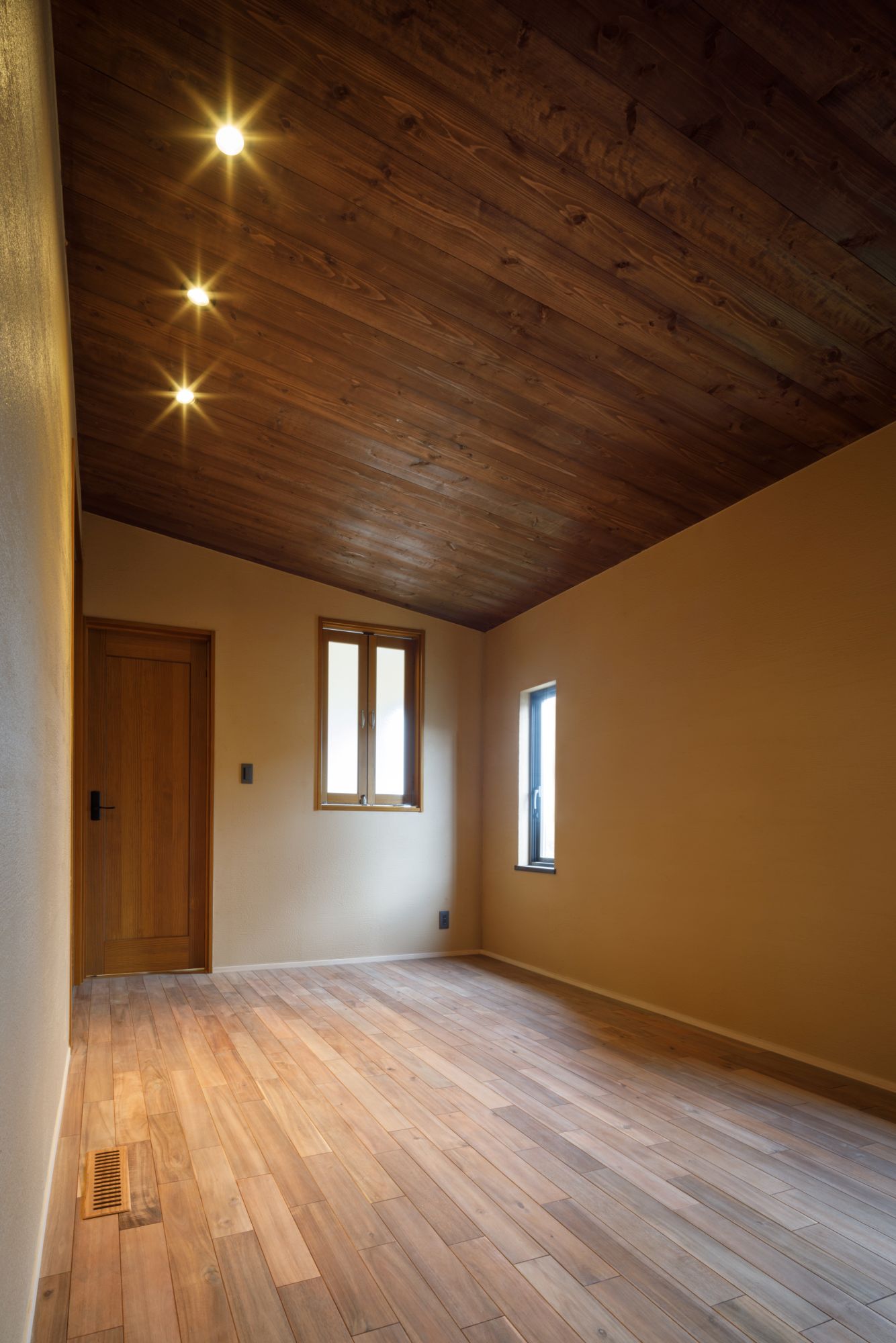書斎は、勾配天井にダークブラウンの化粧梁が映える落ち着いた空間。主寝室は安らぎを感じさせるセージ色の漆喰壁が印象的で、枕元の建築照明がリラックスした時間を演出します。