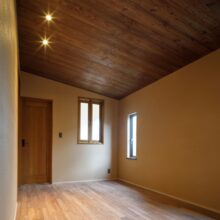 天井には温かみのある米杉のパネリングと、空間を引き締めるダークブラウンに塗装された化粧梁。選び抜かれた素材たちが互いを引き立て合い、高級感と居心地の良さを両立させています。