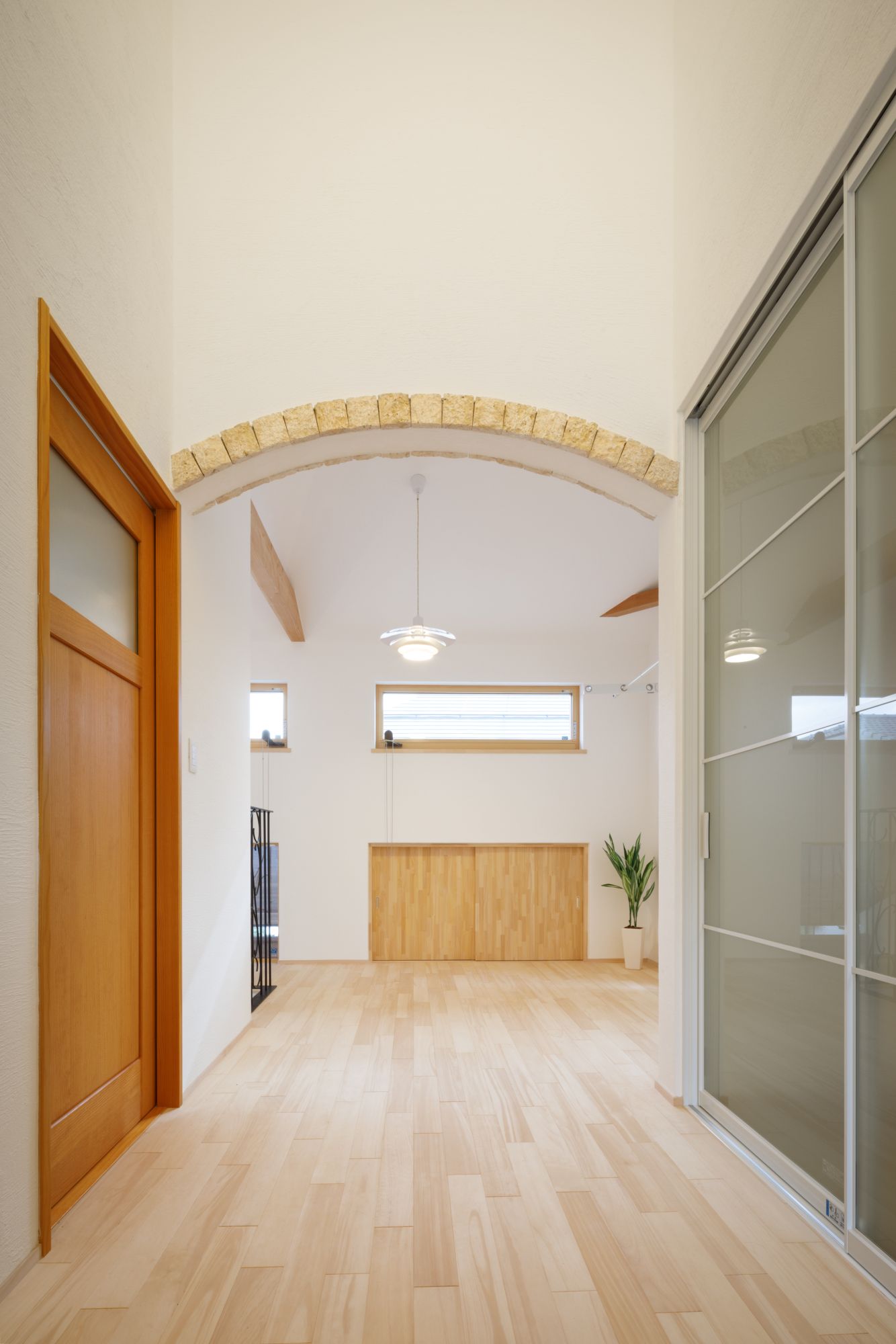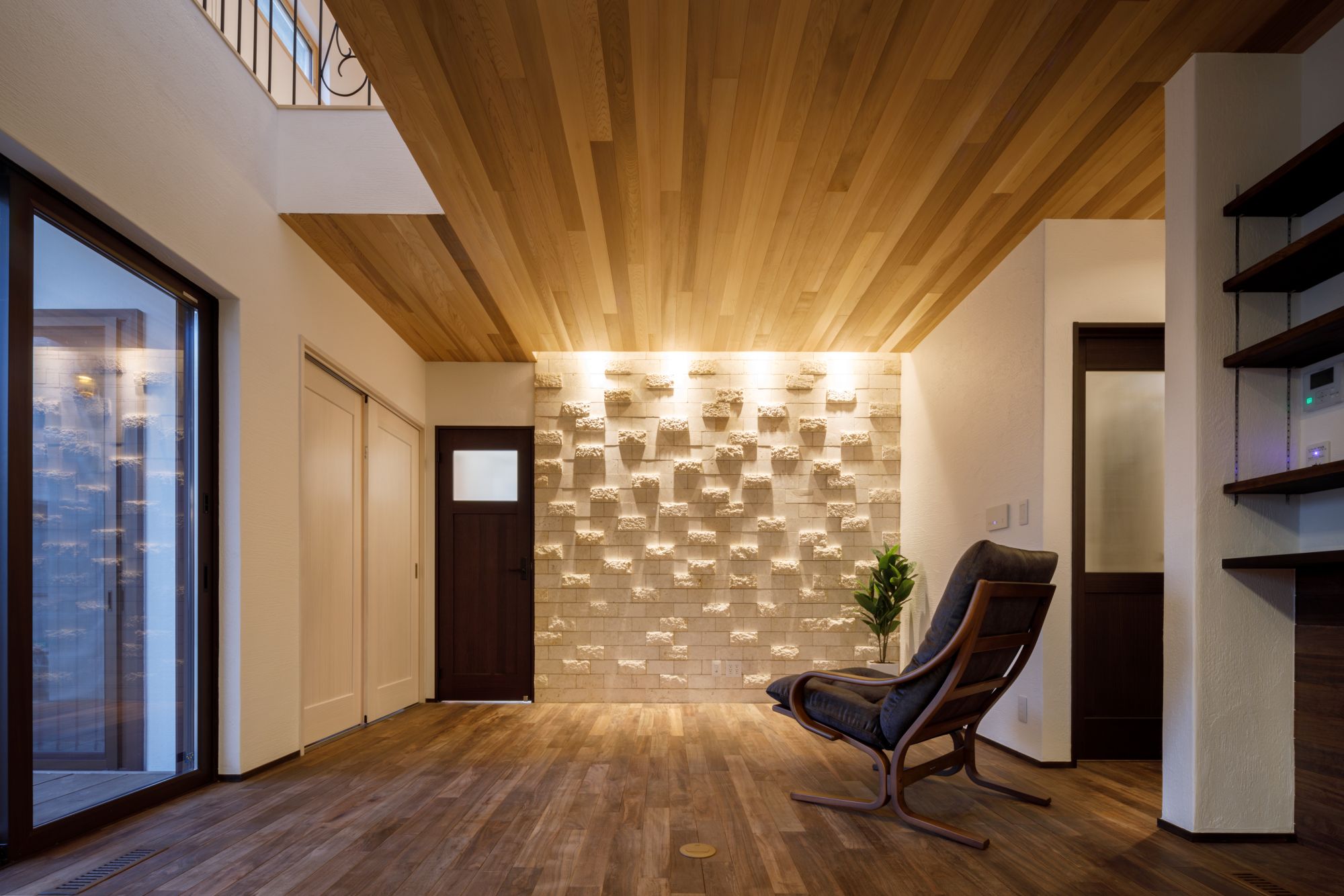 住まいの中心となるLDKは、ご夫婦のこだわりが凝縮された空間です。床には質感の異なる2種類の無添加フローリング(ロックファー、アカシア柿渋)を貼り分け、遊び心のあるデザインに。壁は左官職人の手仕事が光る漆喰塗りを基本としながら、アクセントに凹凸の異なるコーラルストンをあしらい、陰影豊かな表情を演出しています。