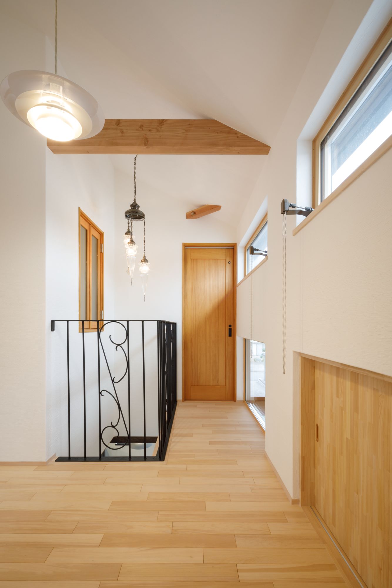 2階へと続く階段にはシャープなアイアン手摺を採用。吹き抜けを通して1階と2階を緩やかにつなぎ、開放感をもたらします。