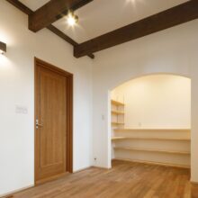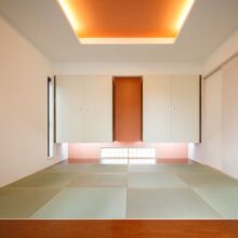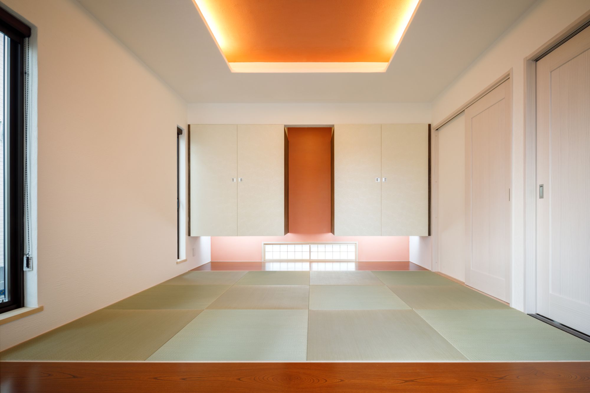 リビングに隣接する和室は、モダンな縁無し畳がすっきりとした印象を与えます。一方で、壁には深みのあるベンガラ色の色漆喰を、床の間には美しい木目の欅(けやき)を採用。伝統的な素材をモダンな空間に落とし込み、凛とした静けさと品格を感じさせる、上質なおもてなしの場となりました。