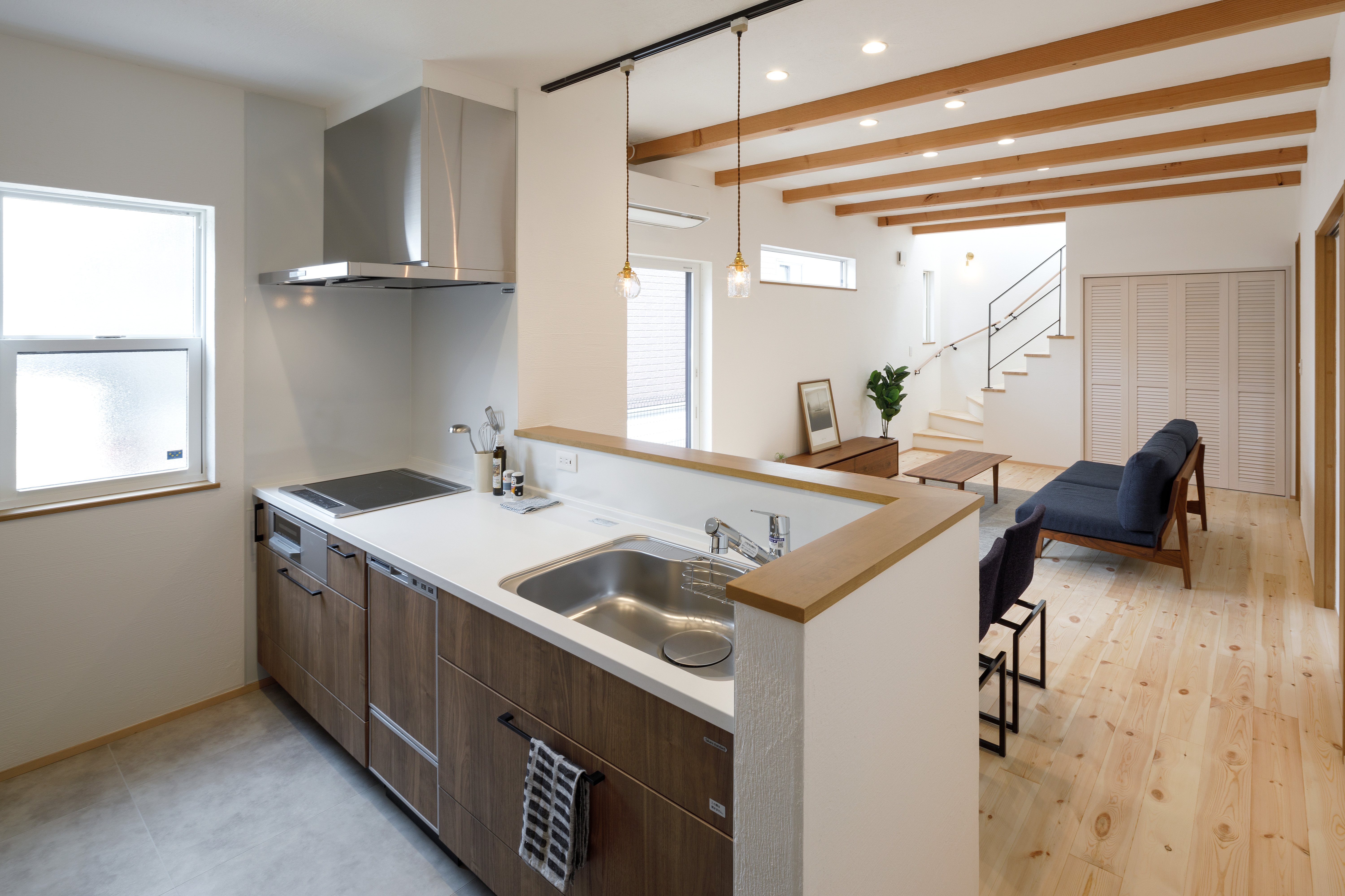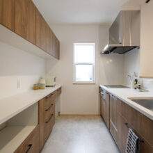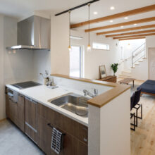 キッチンは、リビングダイニングを見渡せる対面式。料理をしながらでも家族との会話が弾み、自然とコミュニケーションが生まれます。床には温かみのあるロシアンパインを使用。空間全体をナチュラルな雰囲気で包み込み、より一層、居心地の良い空間を演出します。