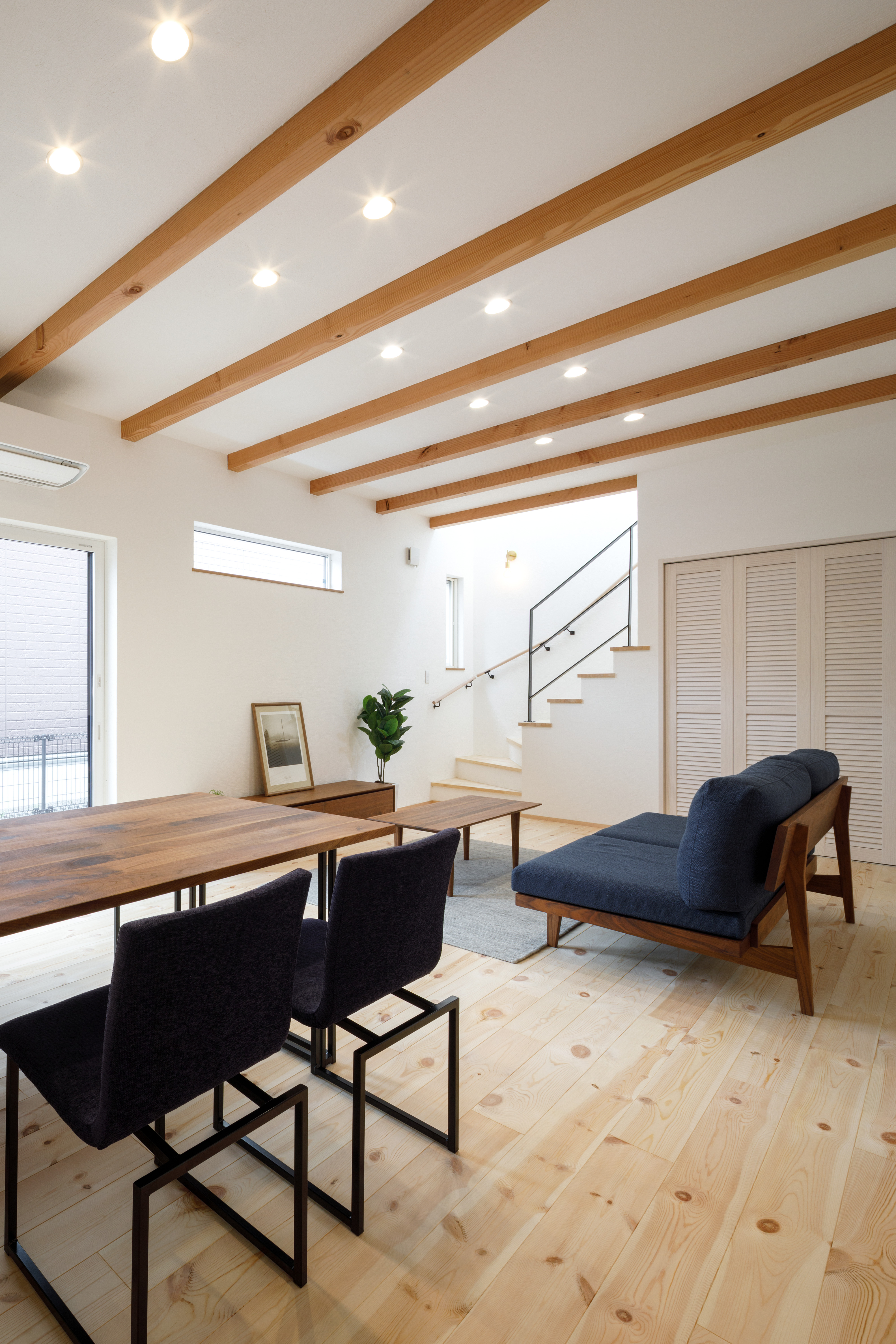 リビング階段には、シンプルなアイアンの手すりを採用。空間に軽やかさとスタイリッシュなアクセントを添えています。階段下の空間は、収納スペースとして有効活用。散らかりがちなリビングもスッキリ片付きます。