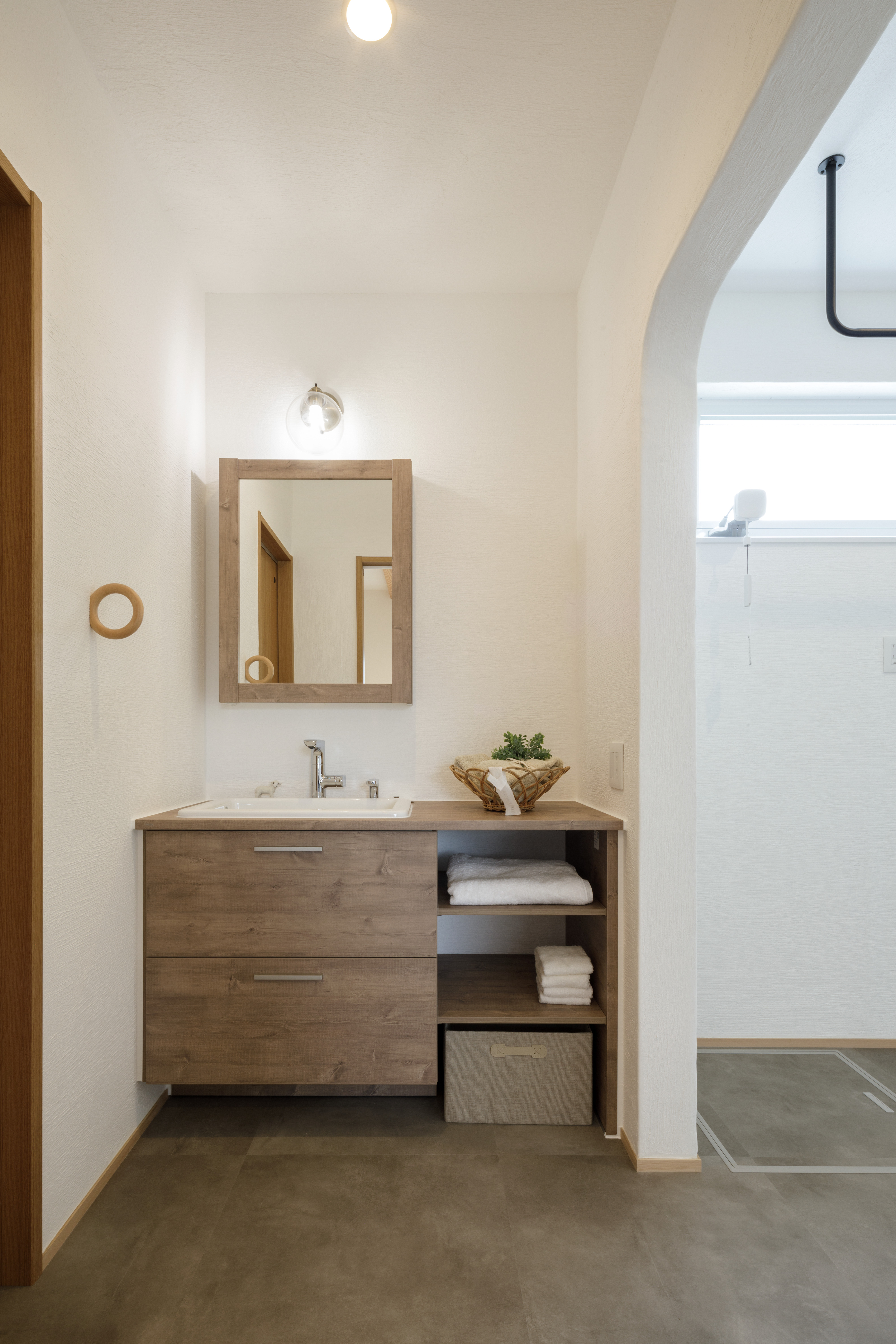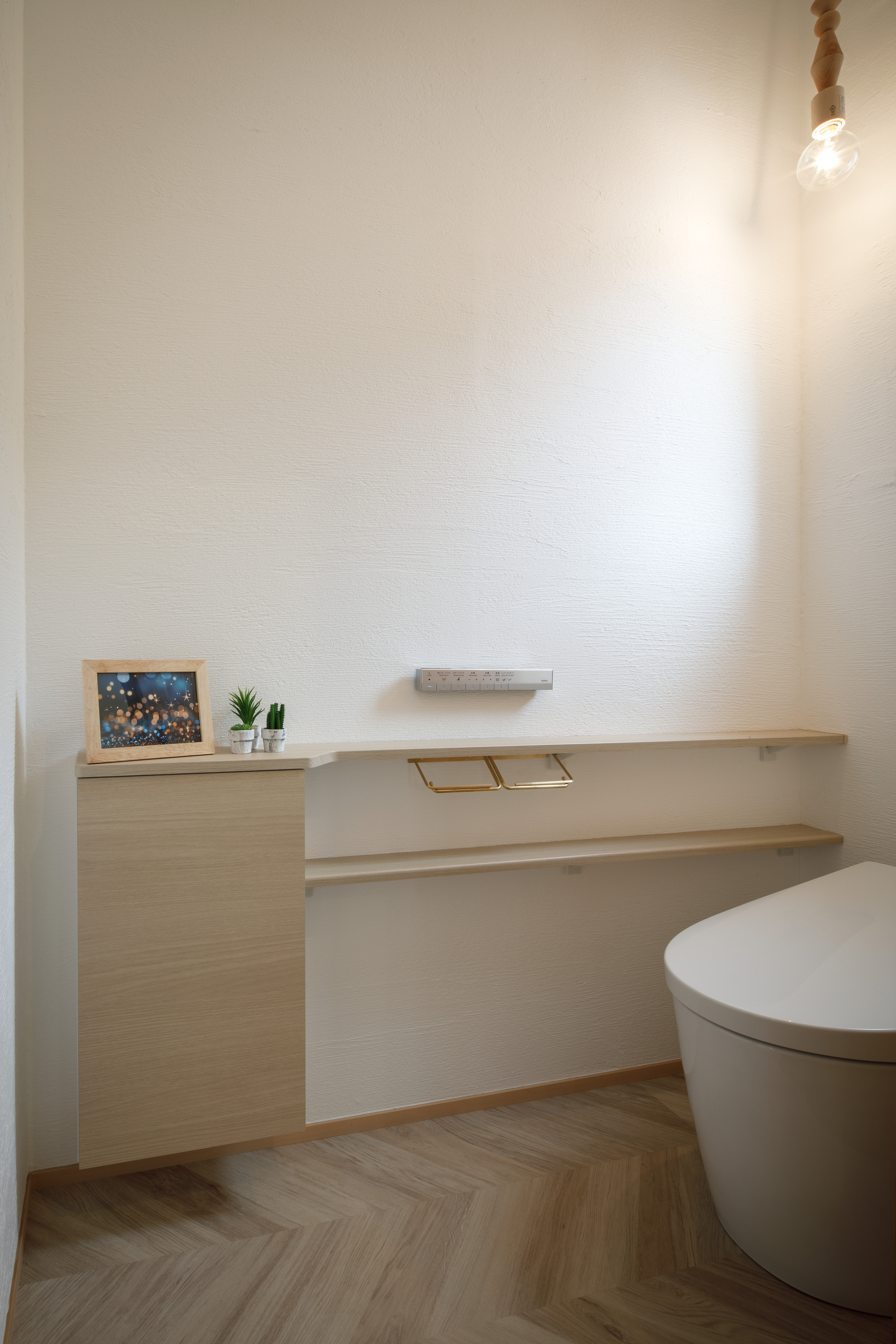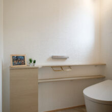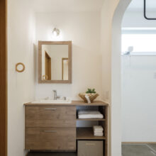 洗面台は無垢材で造作。好きなデザインにすることで日々の暮らしを豊かに彩ります。トイレの床はヘリンボーンに。さりげない遊び心と洗練されたデザインが、空間をワンランク上に昇華させています。