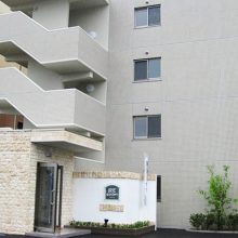 クールなグレーの本体に天然石と漆喰(しっくい)をまとったエントランスが貴賓を添えています。