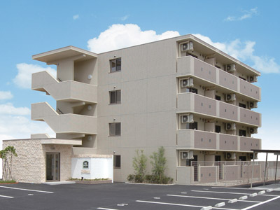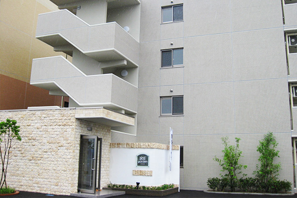 クールなグレーの本体に天然石と漆喰(しっくい)をまとったエントランスが貴賓を添えています。