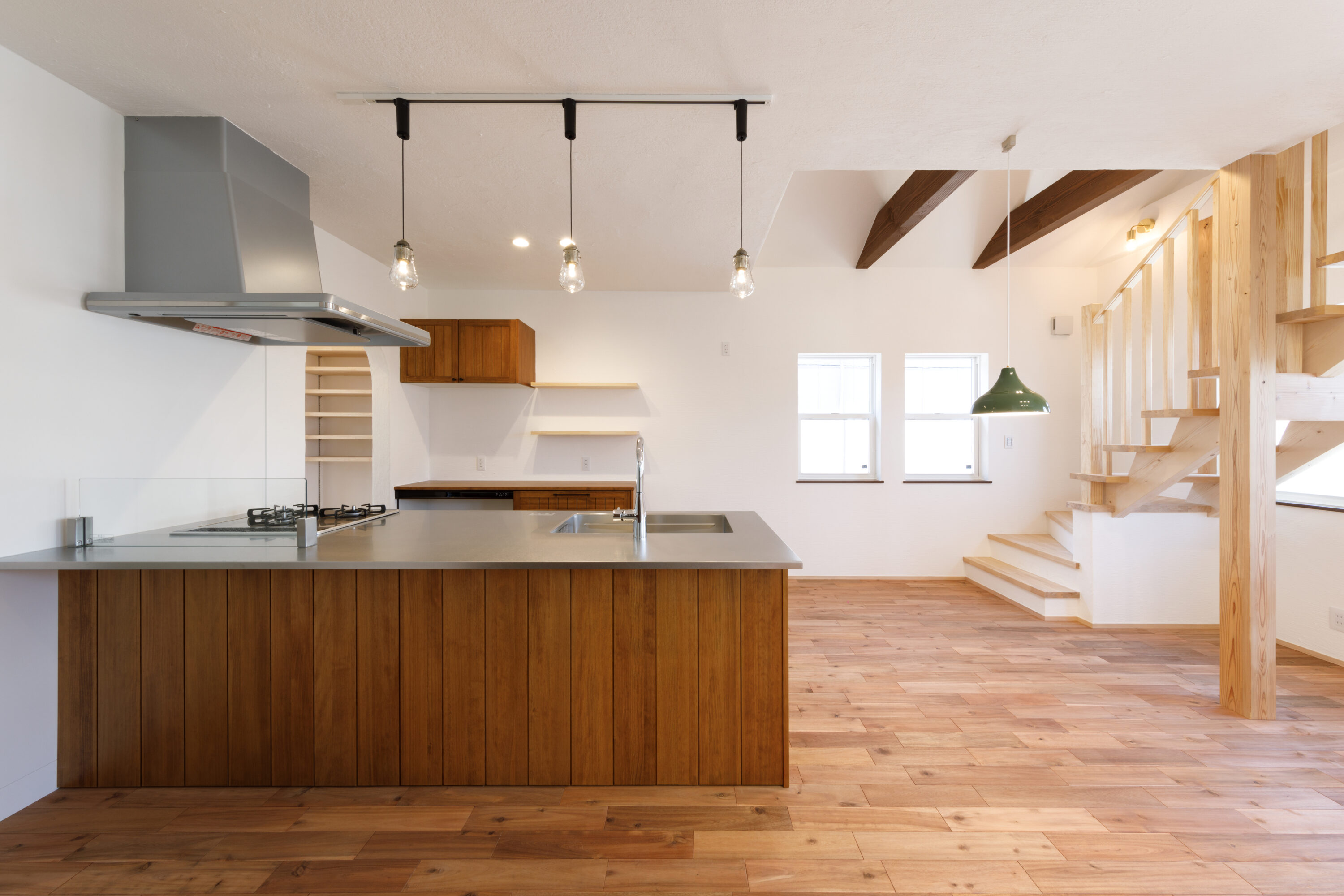 キッチン・パントリー・家事室・洗面脱衣場と水回りの動線を重視し、回遊できる動線に。家事スペースは奥様のご希望により、2階南向きの明るい場所へ配置。キッチンの設備は無垢面材の扉、取手は焼き物(輸入品)、ガスコンロまで、1つ1つに施主様のこだわりを感じます。