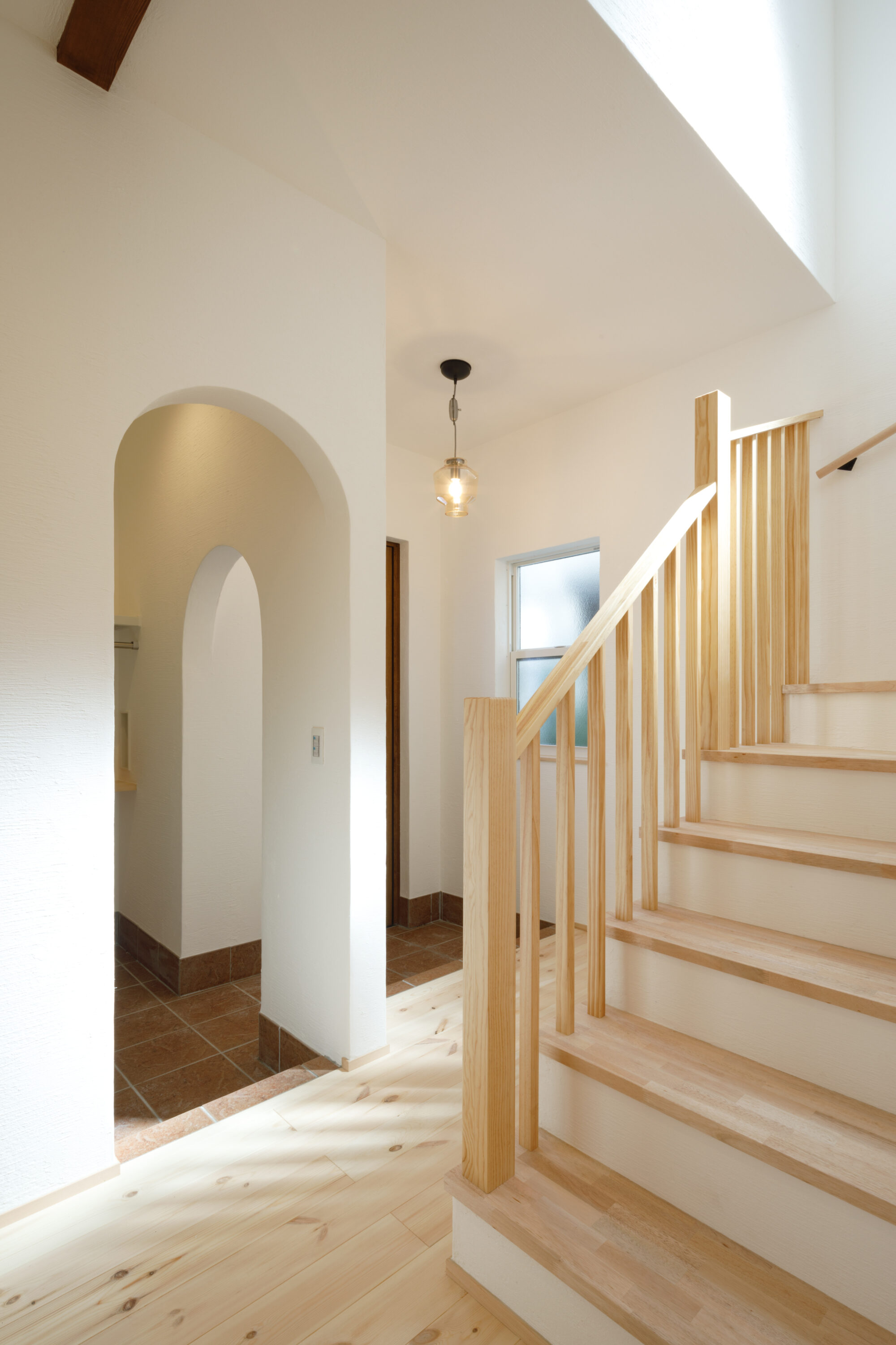 玄関ポーチをアール垂れ壁にし、柔らかい雰囲気を演出。2階リビングにすることで、お部屋全体を明るい印象に仕上げました。