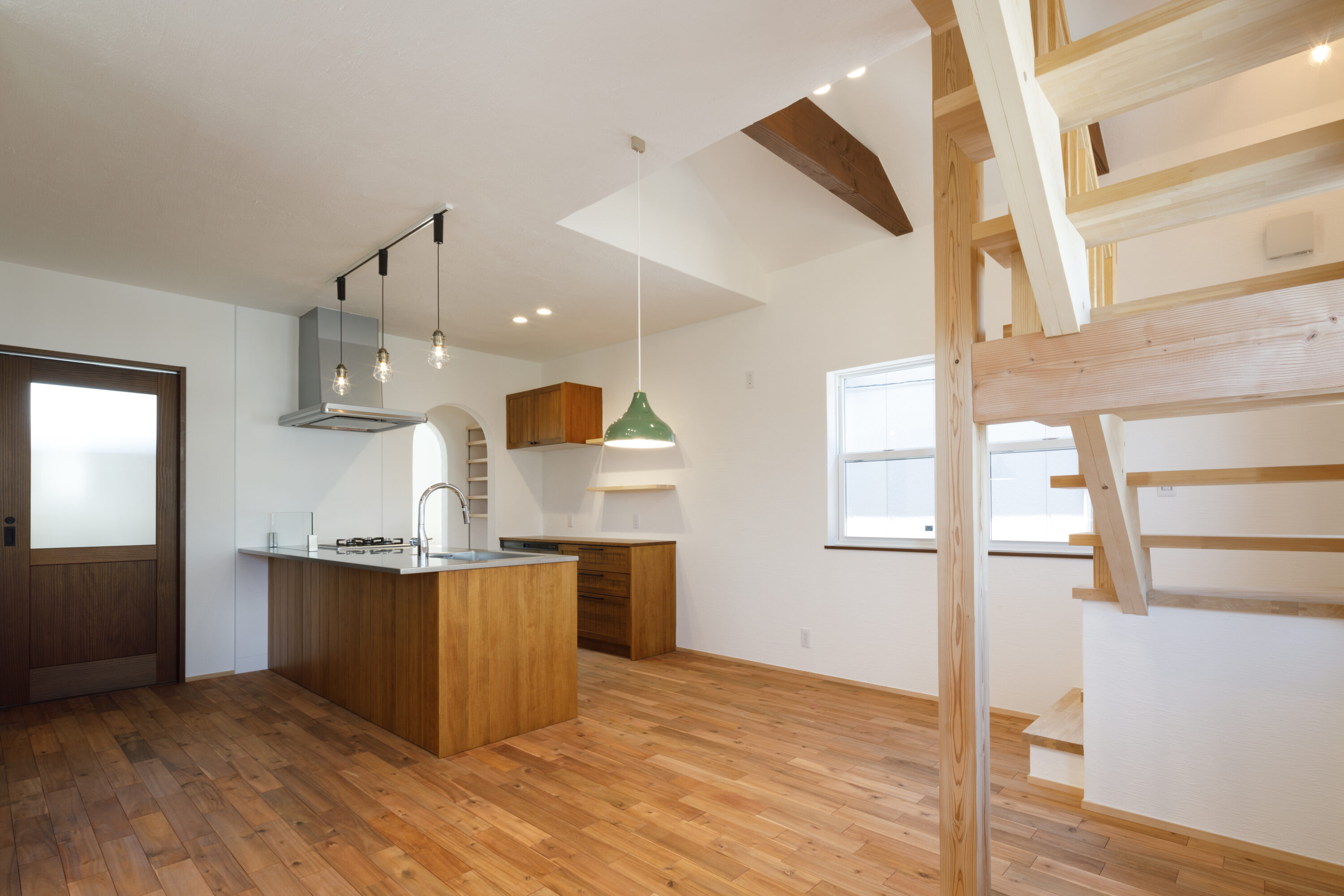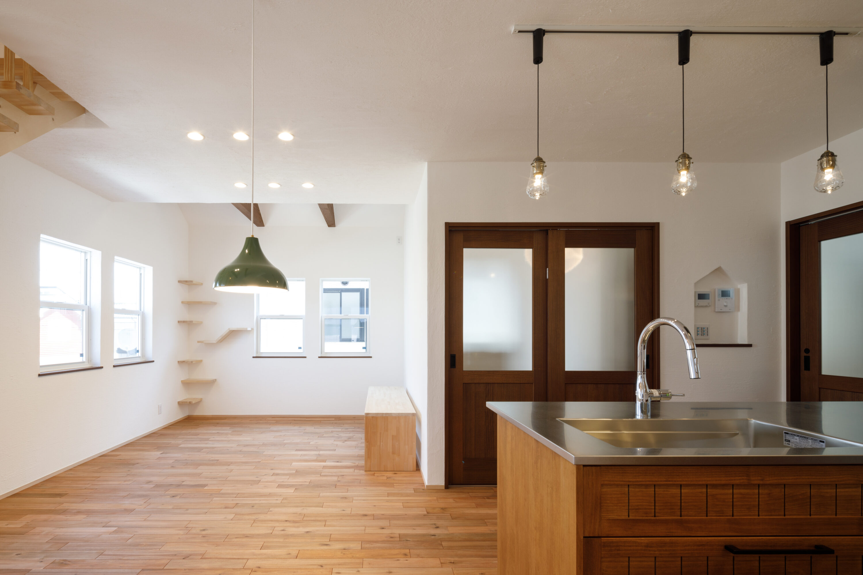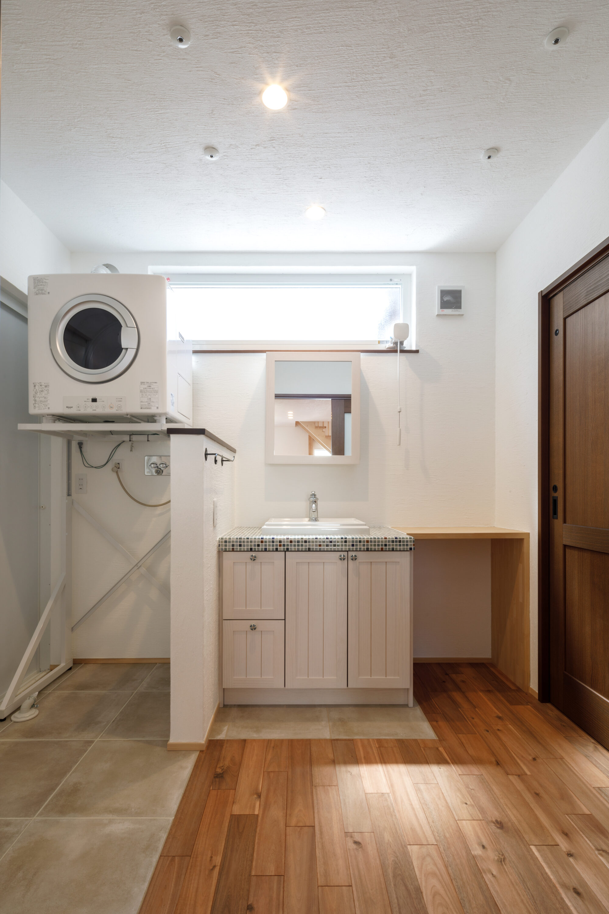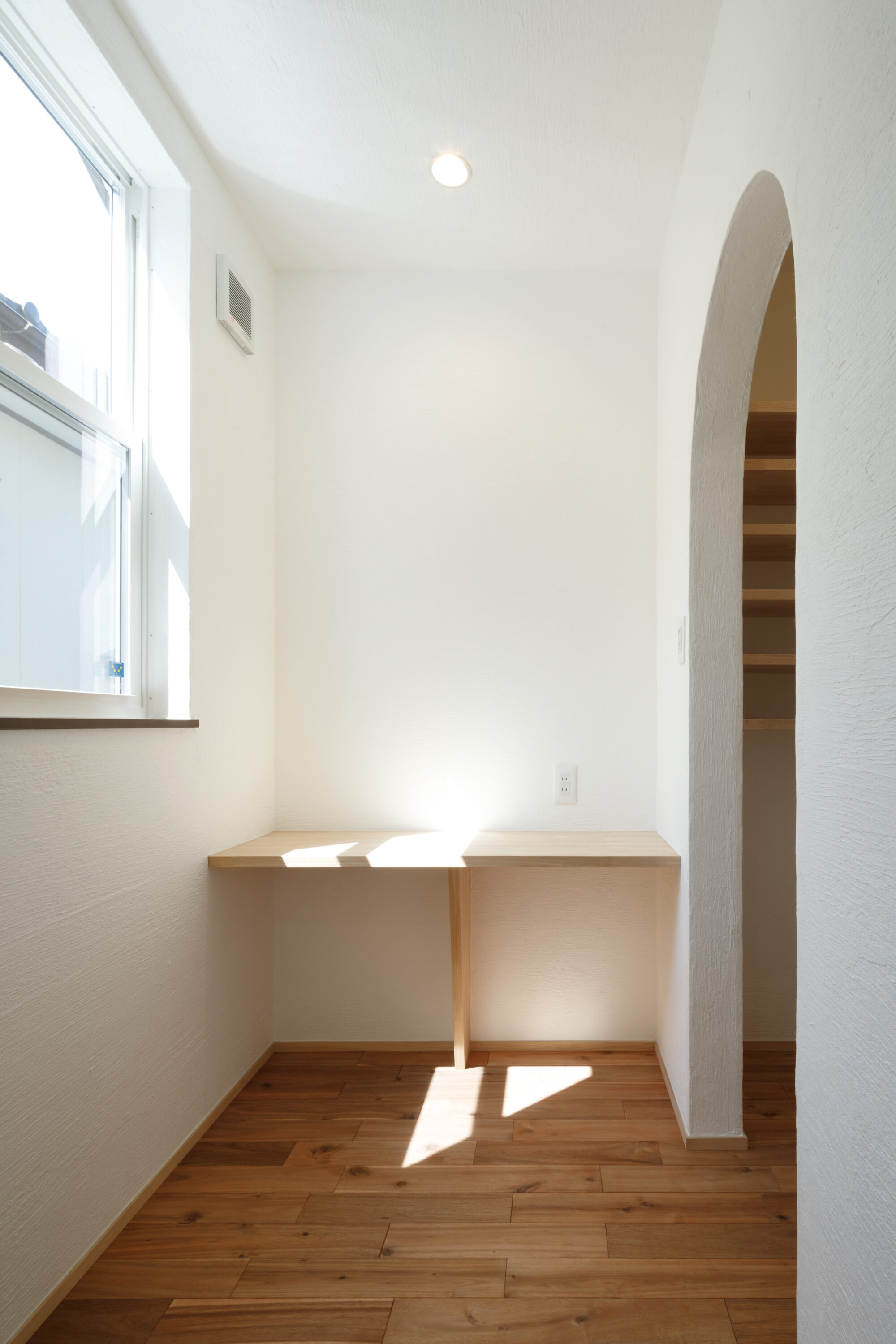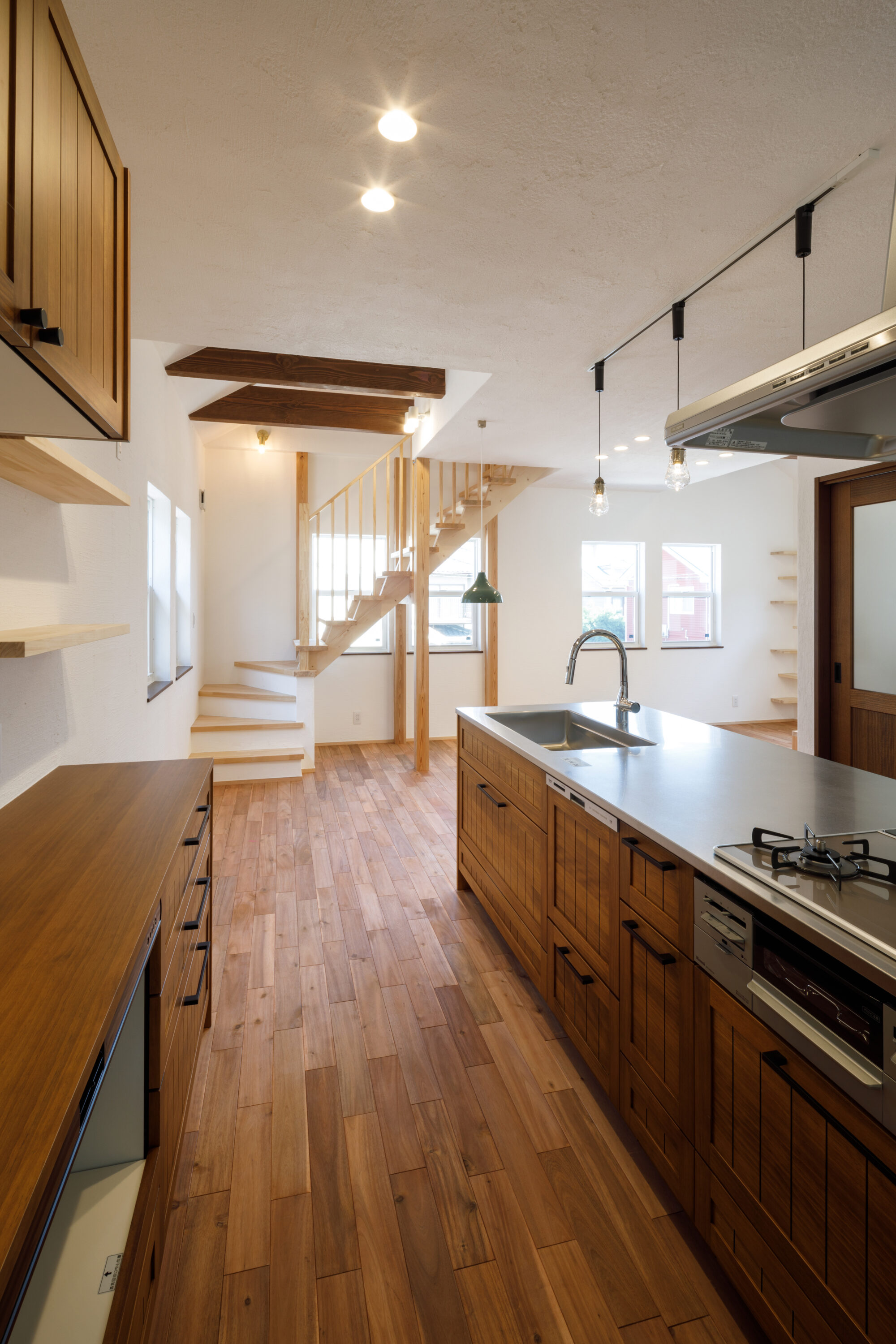 キッチン・パントリー・家事室・洗面脱衣場と水回りの動線を重視し、回遊できる動線に。家事スペースは奥様のご希望により、2階南向きの明るい場所へ配置。キッチンの設備は無垢面材の扉、取手は焼き物(輸入品)、ガスコンロまで、1つ1つに施主様のこだわりを感じます。