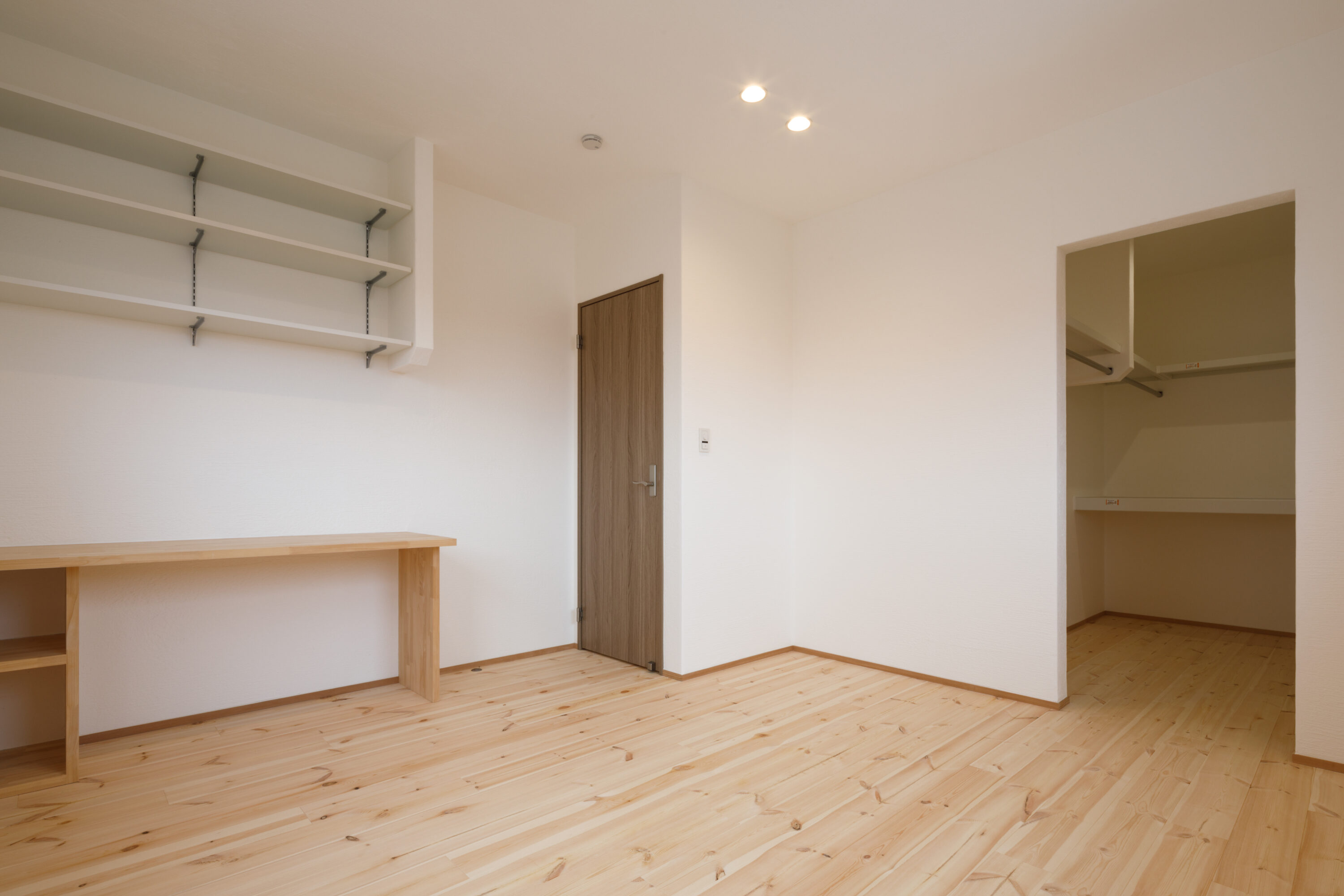主寝室にはカウンターを造作。本を読んだりPCを置いたり、書斎や趣味のスペースとして自分時間を豊かに彩ります。可動棚や広々としたウォークインクローゼットも備え、収納力も抜群です。