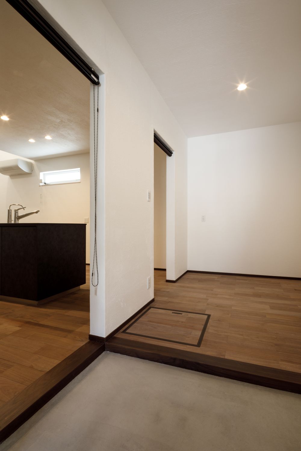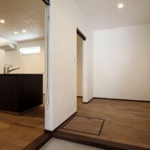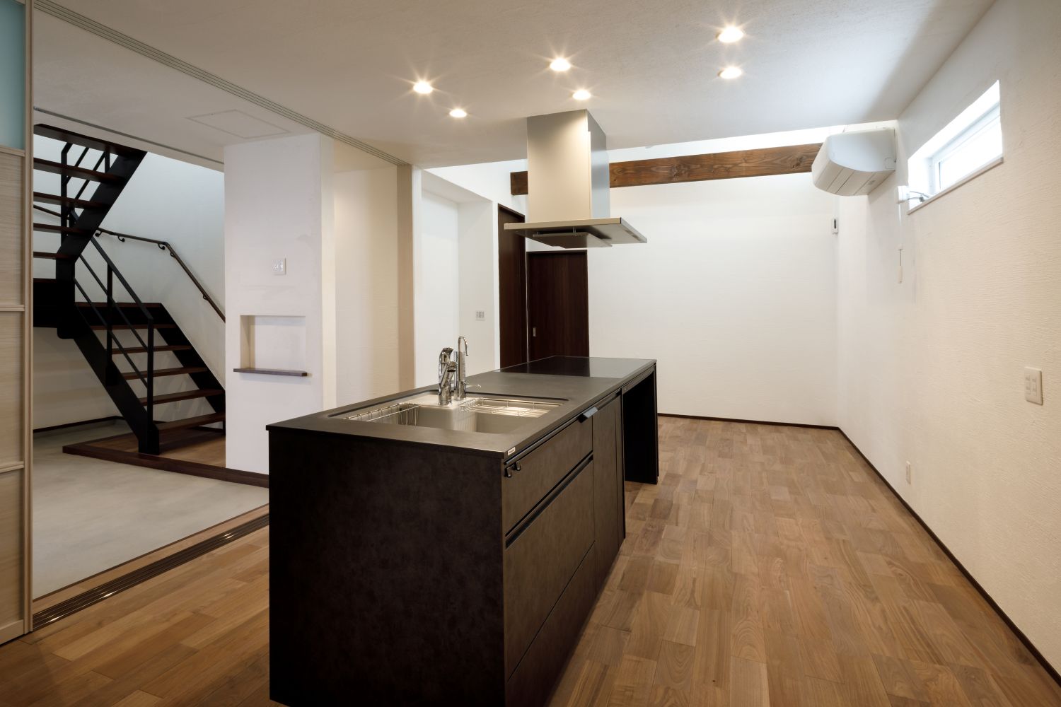 キッチンには、Panasonic L-CLASSの「アイランド型Iroriダイニング」を設置し、3口並んだIHを中心に家族が自然と集まる設計に。玄関から続く広い土間は、4枚引き違い戸を開け放てばリビングと一体化する開放的な大空間へと広がります。