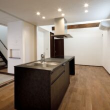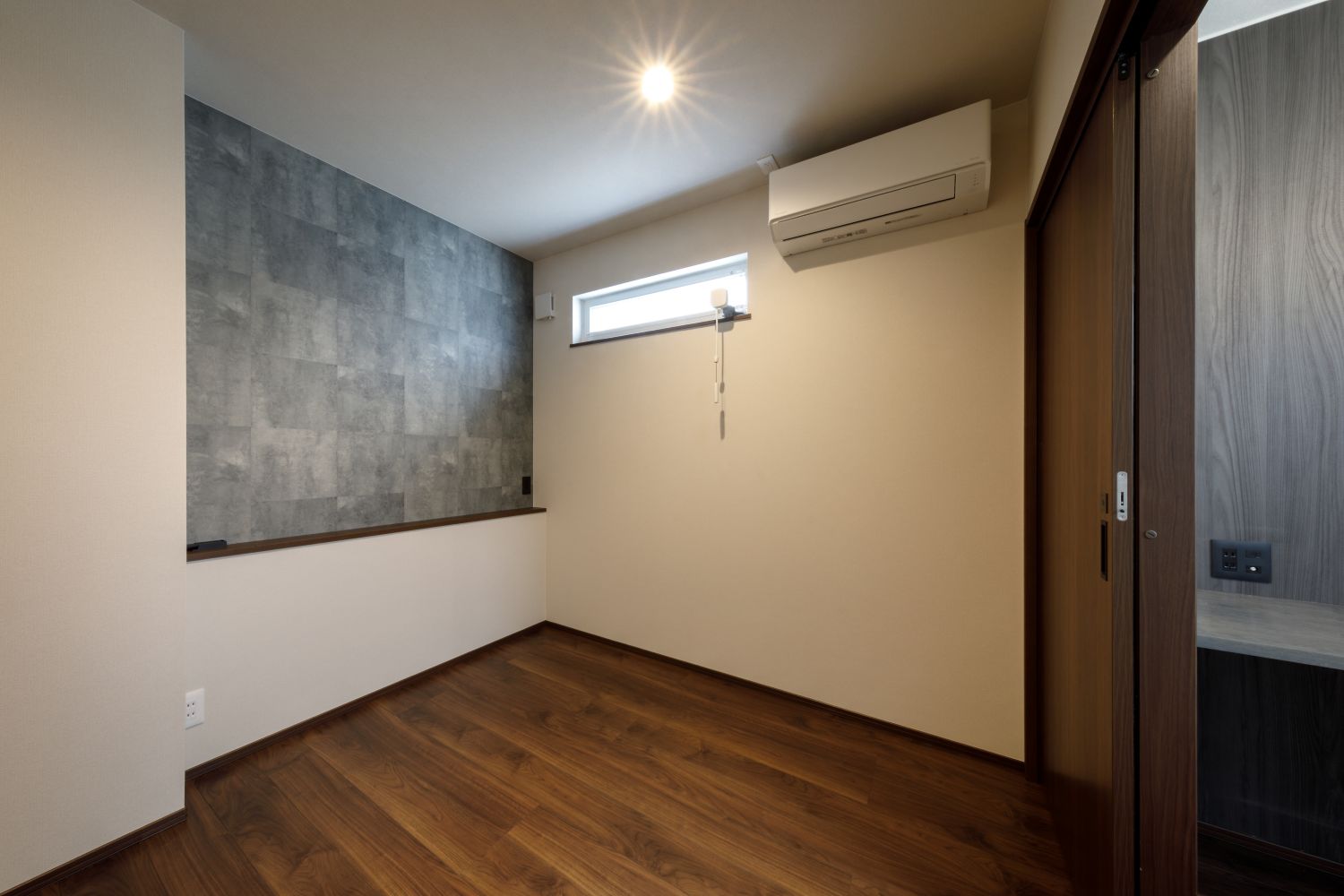 外観は、白いストライプ系の金属サイディングに黒縁サッシと意匠性の高い雨樋を組み合わせた、シャープでスタイリッシュな佇まいに。1階は自然素材の心地よさを活かした空間で、壁と天井には調湿効果のある無添加住宅オリジナル漆喰、床には重厚感のあるブラックウォールナットの無垢フローリングを採用しました。