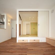 リビングの一角には、4.5帖の小上がりの和室を設けました。普段はリビングとの一体空間として開放的に使い、来客時やちょっとした個室として利用したいときには、引き戸で仕切って独立した空間にすることができます。畳の下は引き出し収納になっており、座布団などをしまうことができ、空間を有効活用できます。