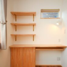 キッチンは、料理をしながらでもリビング全体を見渡せる人気の対面式。家族や愛犬の様子を見守りながら、楽しく調理ができます。キッチンのすぐ近くには、ちょっとした休憩や読書に最適なカウンターを設置。家事の合間に一息ついたり、趣味の時間を楽しんだり、多目的に活用できる便利なスペースです。