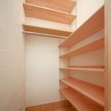 玄関を入ってまず目を引くのは、シューズクロークの一部に設けられた愛犬専用のシャワースペース。お散歩で汚れた足をすぐに洗い流せるのはもちろん、休日はゆったりとシャワータイムを楽しむことができます。ワンちゃんグッズをしまえる棚もあり、リードやタオル、おもちゃなどをまとめて収納することで、お出かけの準備が簡単にできます。可動式のため、柔軟に高さを調整できるのも魅力です。