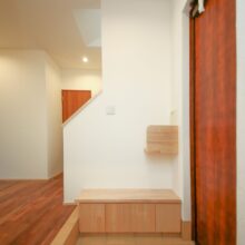 玄関ホールには、靴の脱ぎ履きやちょっとした荷物置きに便利な造作ベンチを設置。座面の下は収納ボックスになっており、季節の靴や防災グッズなどをしまうことができます。機能性とデザイン性を兼ね備えたベンチは、空間のアクセントとしても一役買っています。