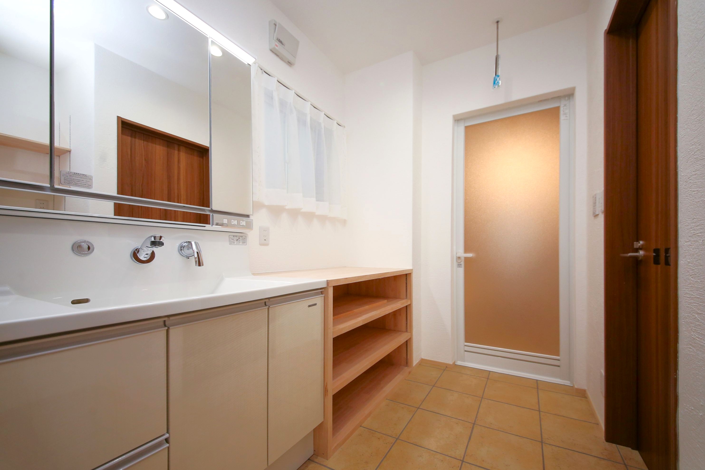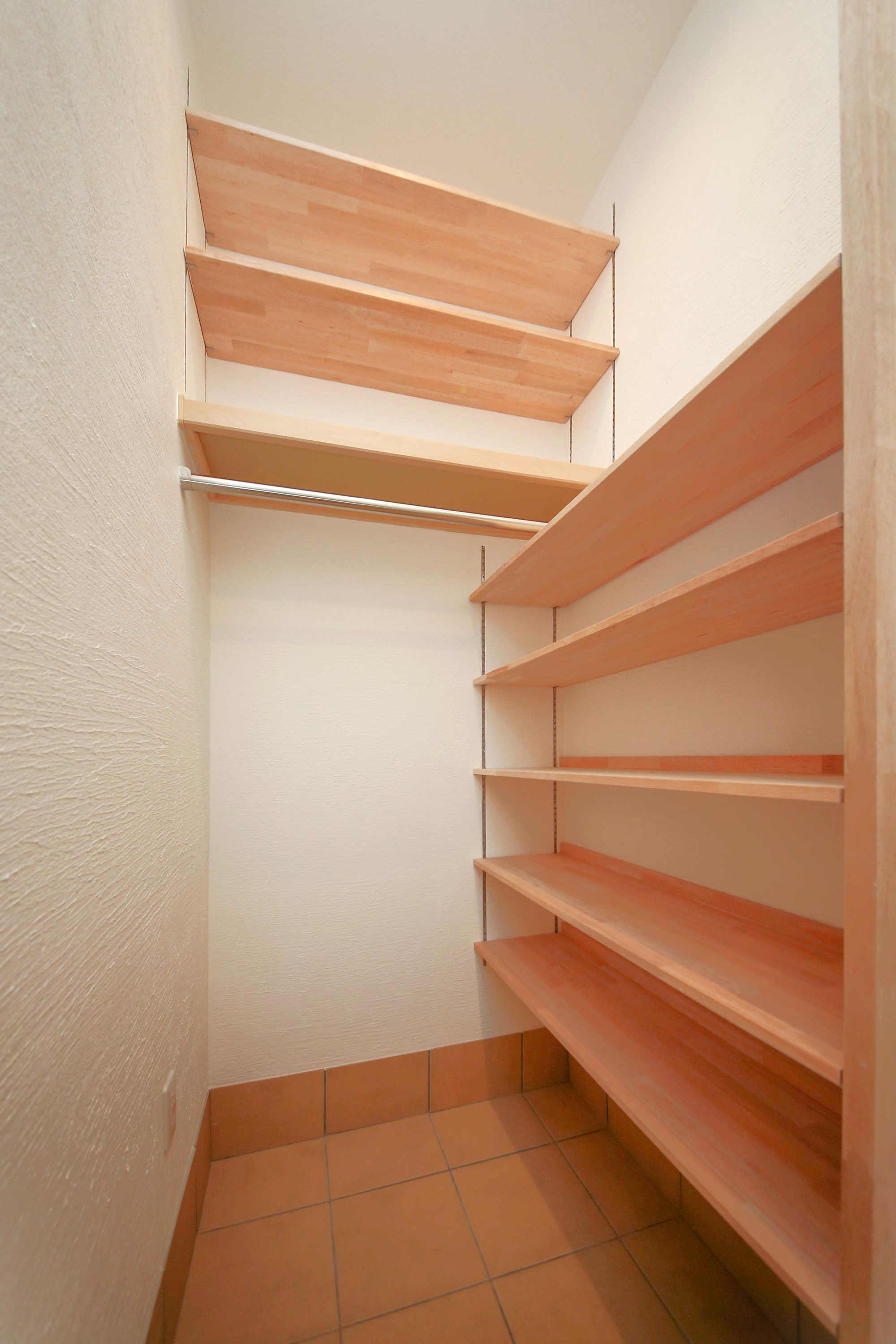 玄関を入ってまず目を引くのは、シューズクロークの一部に設けられた愛犬専用のシャワースペース。お散歩で汚れた足をすぐに洗い流せるのはもちろん、休日はゆったりとシャワータイムを楽しむことができます。ワンちゃんグッズをしまえる棚もあり、リードやタオル、おもちゃなどをまとめて収納することで、お出かけの準備が簡単にできます。可動式のため、柔軟に高さを調整できるのも魅力です。