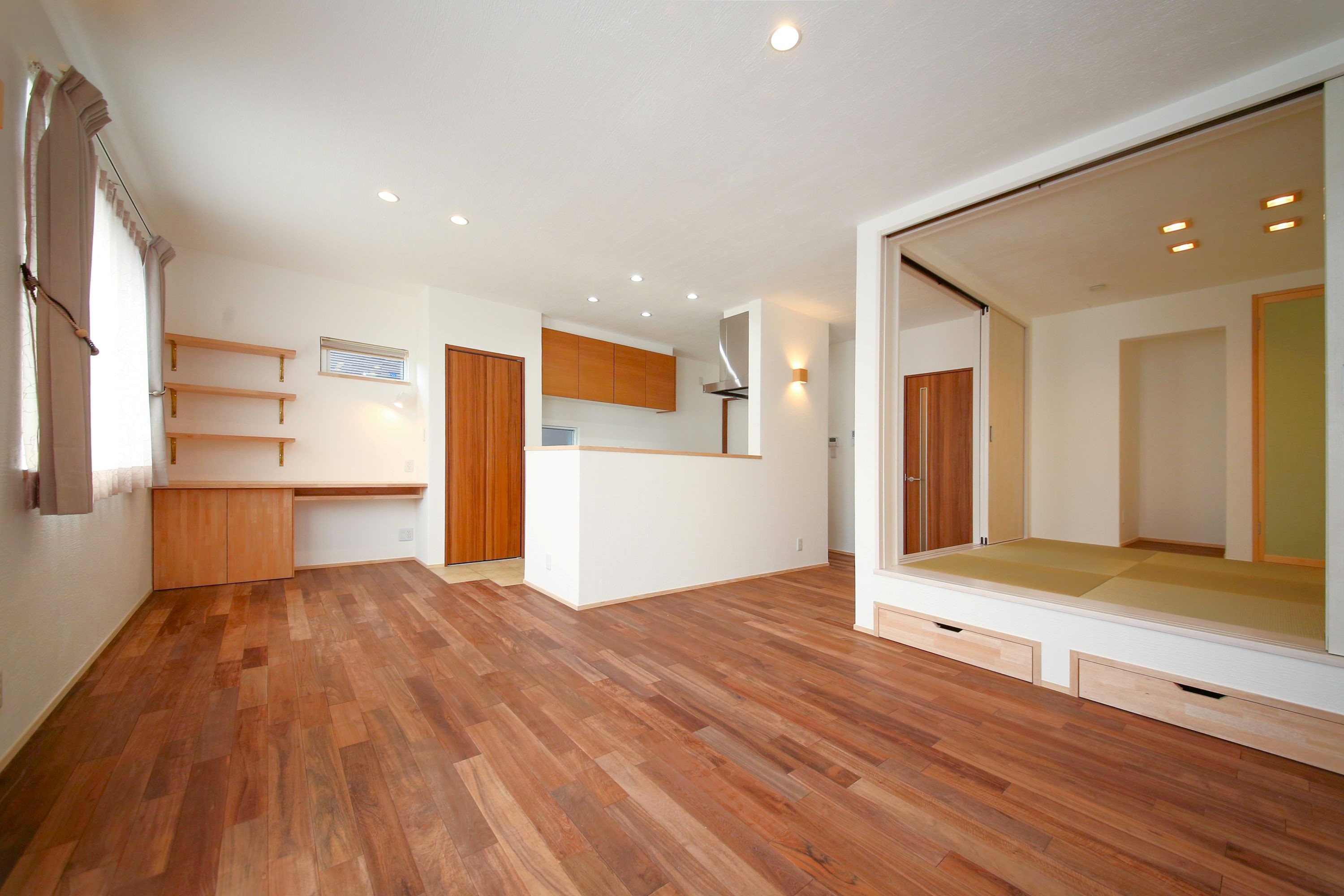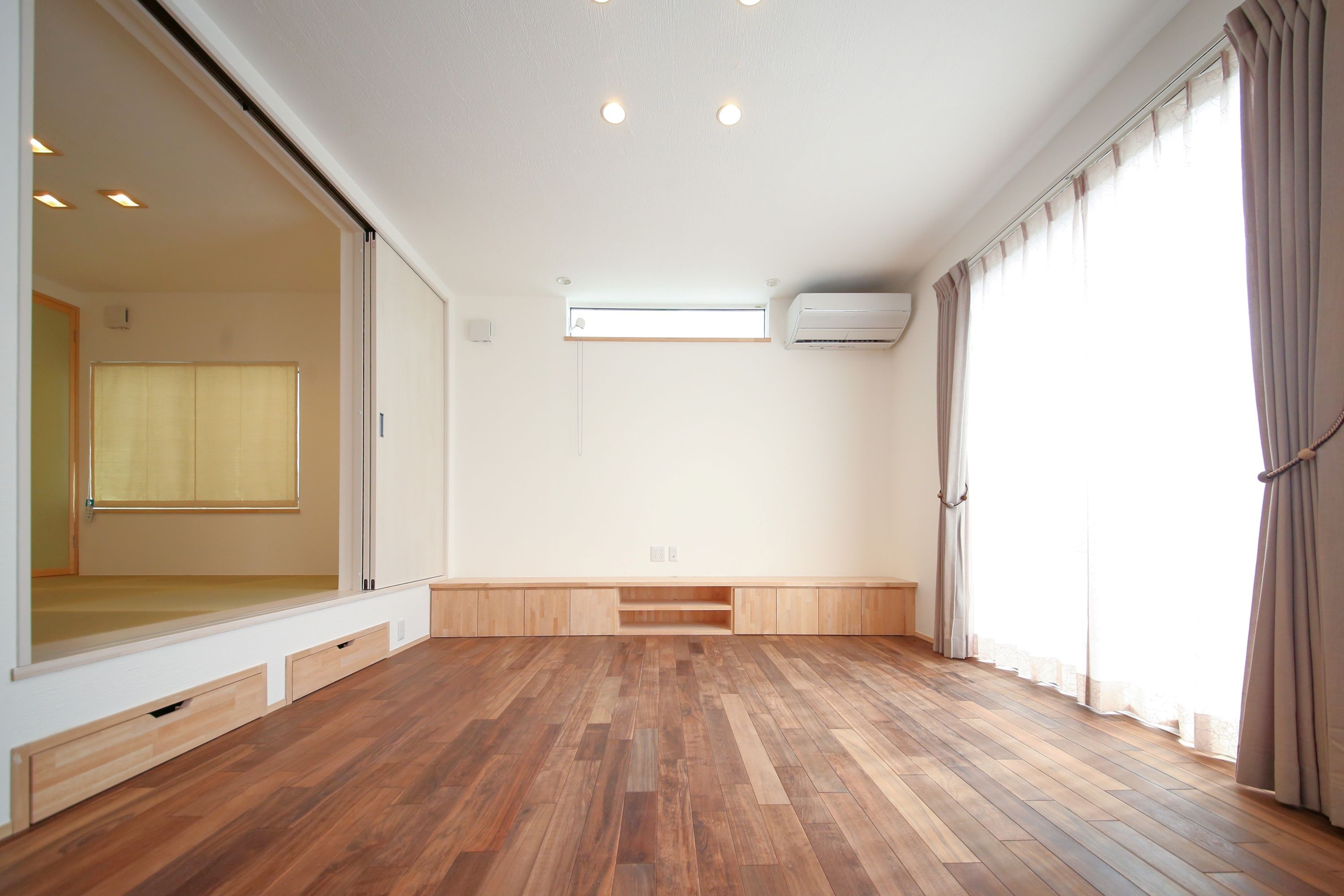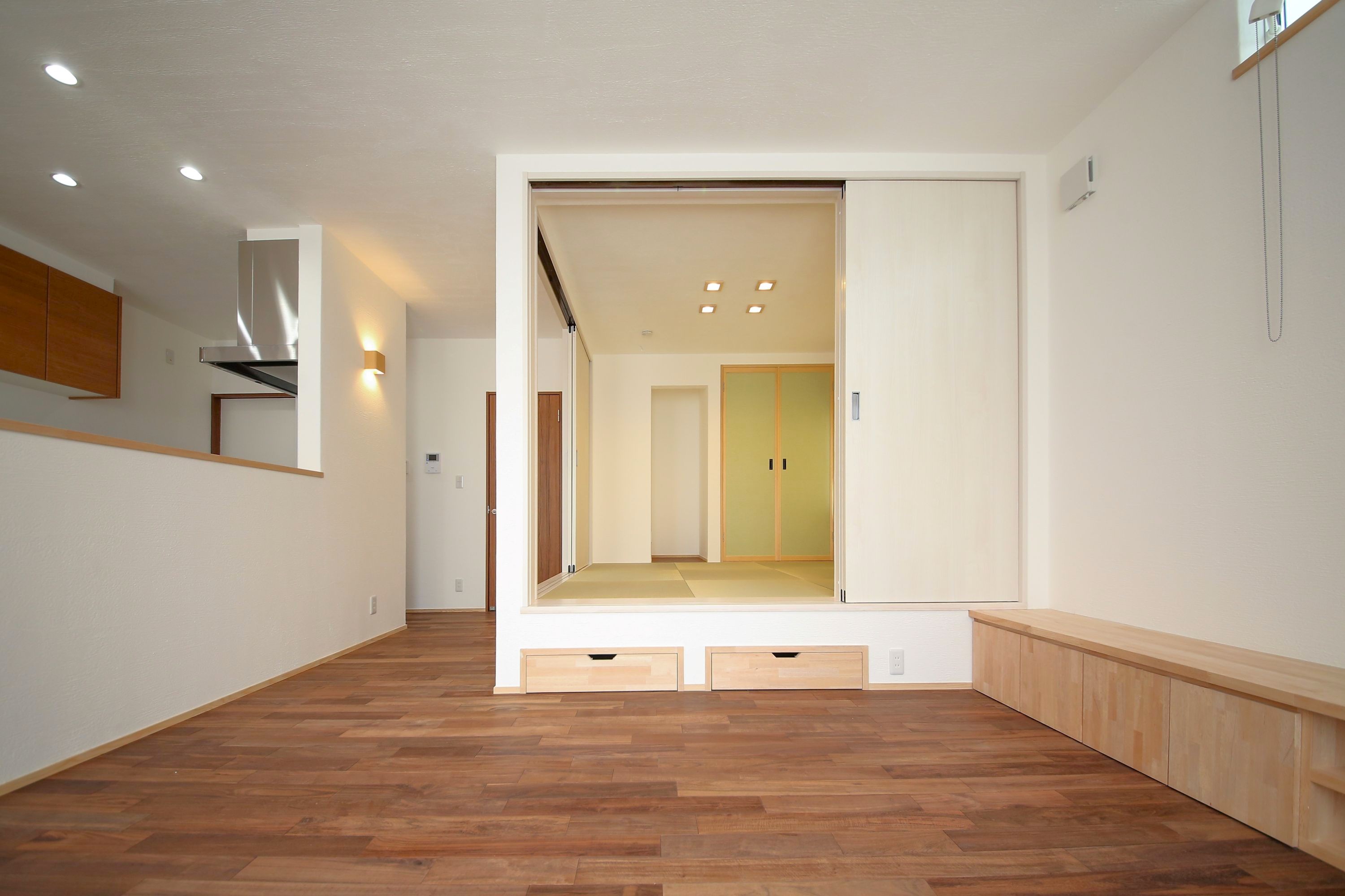 リビングの一角には、4.5帖の小上がりの和室を設けました。普段はリビングとの一体空間として開放的に使い、来客時やちょっとした個室として利用したいときには、引き戸で仕切って独立した空間にすることができます。畳の下は引き出し収納になっており、座布団などをしまうことができ、空間を有効活用できます。