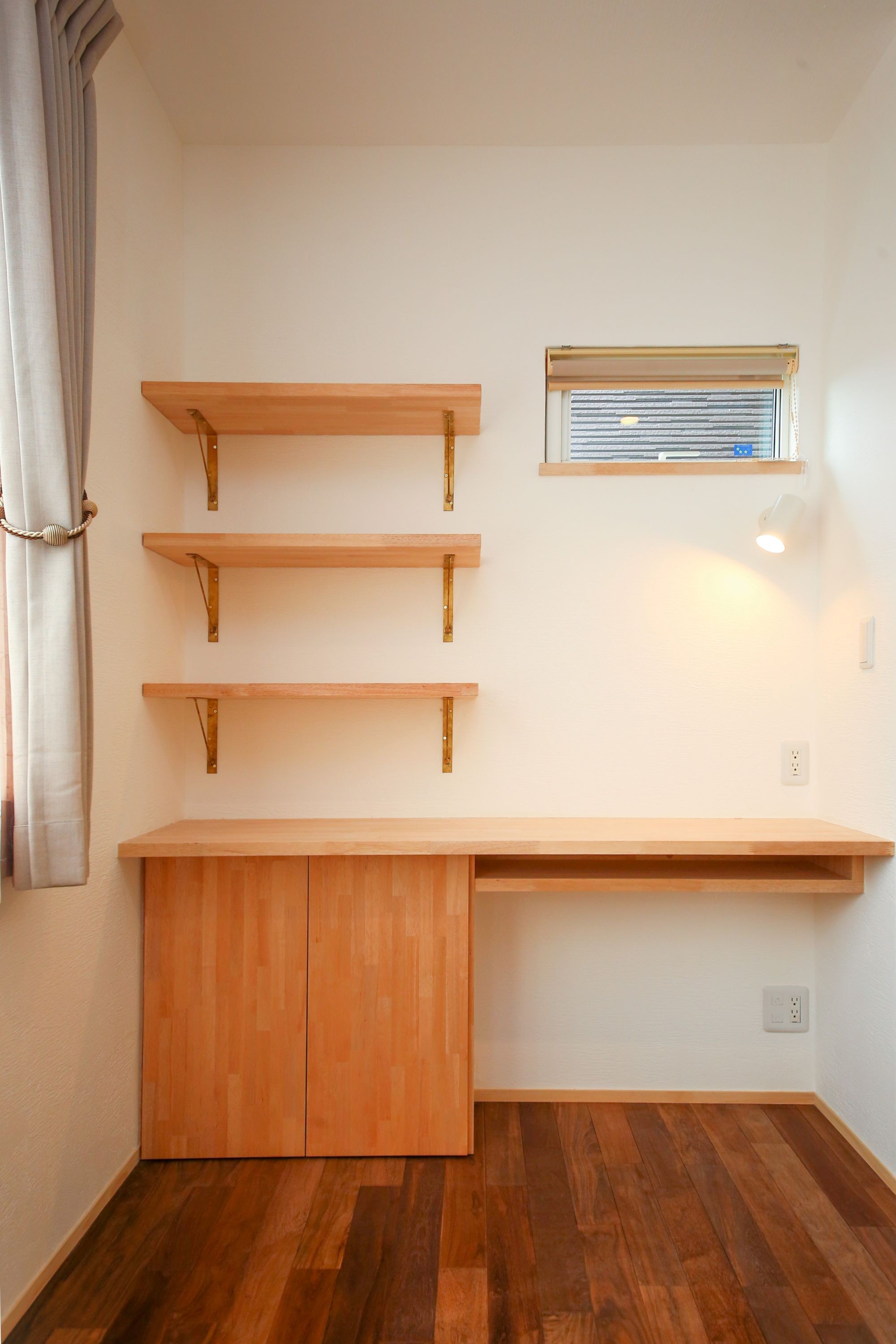 キッチンは、料理をしながらでもリビング全体を見渡せる人気の対面式。家族や愛犬の様子を見守りながら、楽しく調理ができます。キッチンのすぐ近くには、ちょっとした休憩や読書に最適なカウンターを設置。家事の合間に一息ついたり、趣味の時間を楽しんだり、多目的に活用できる便利なスペースです。
