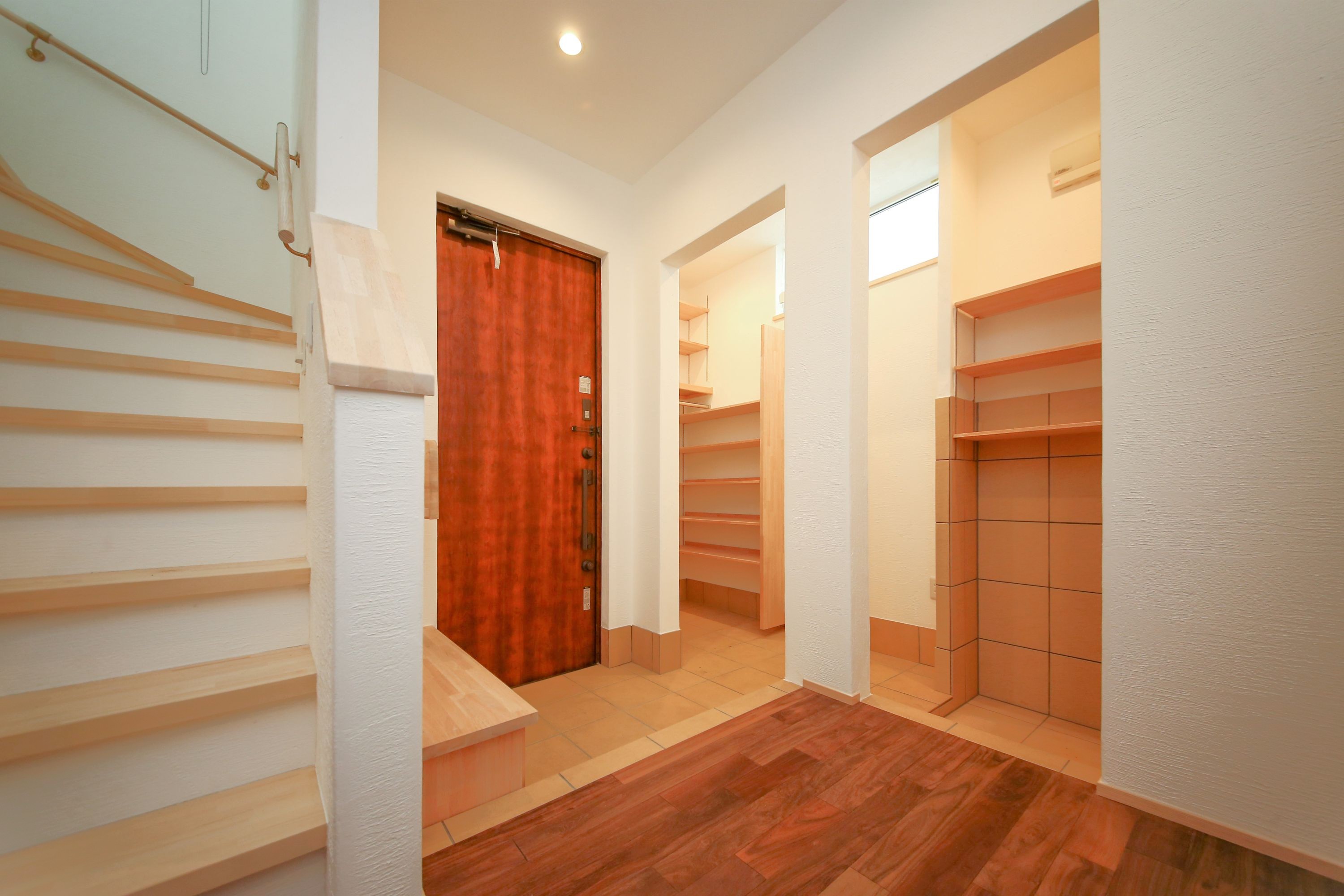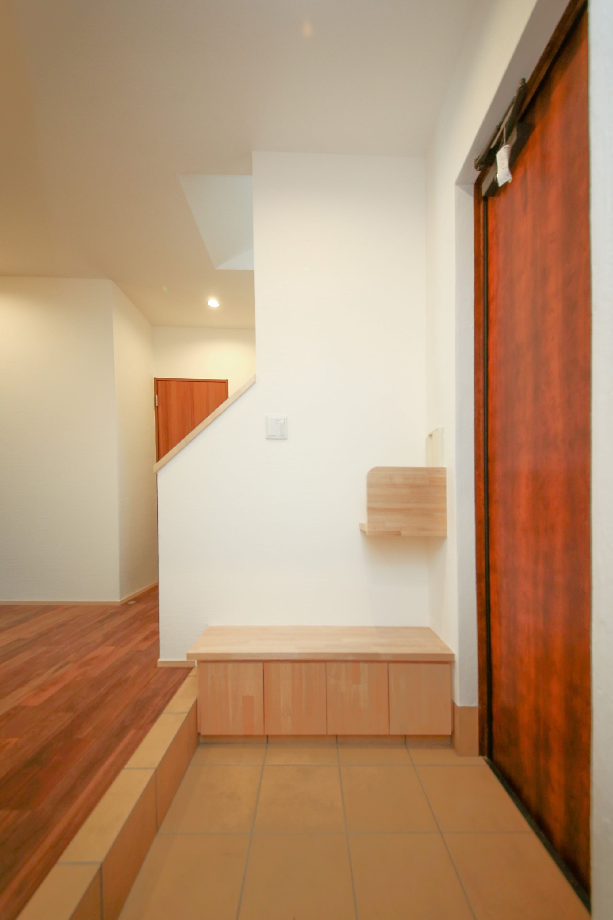 玄関ホールには、靴の脱ぎ履きやちょっとした荷物置きに便利な造作ベンチを設置。座面の下は収納ボックスになっており、季節の靴や防災グッズなどをしまうことができます。機能性とデザイン性を兼ね備えたベンチは、空間のアクセントとしても一役買っています。