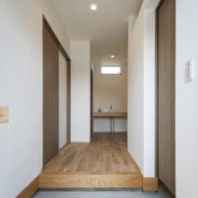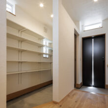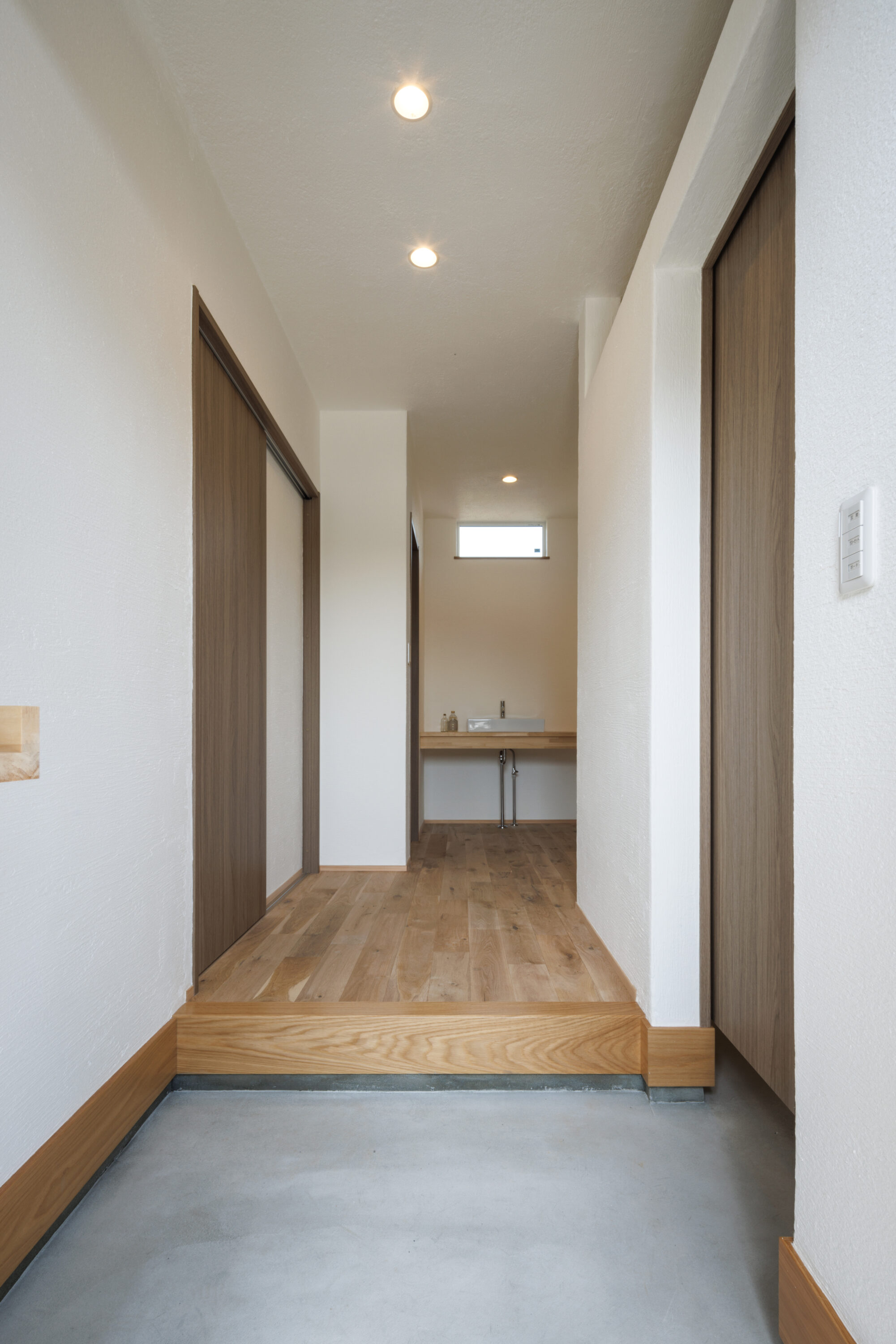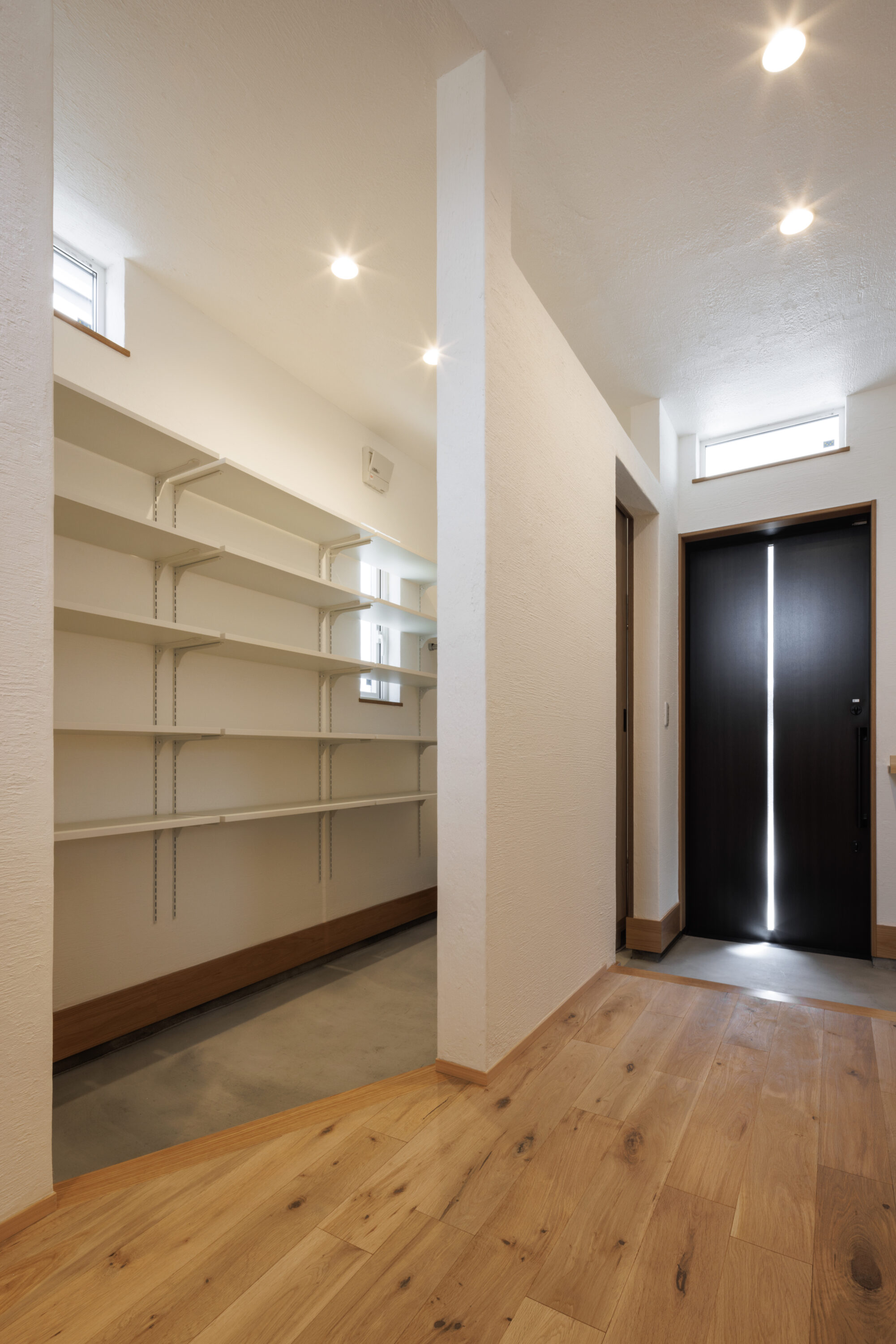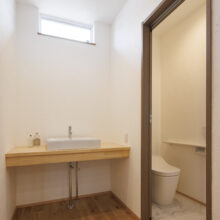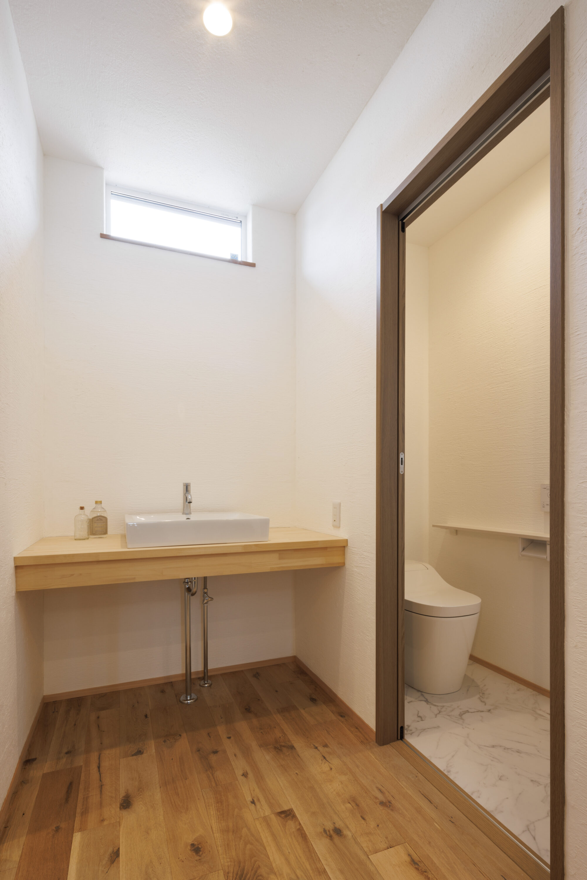 さらに、家事効率を格段にアップさせる工夫も満載。脱衣室には、洗濯から収納までを完結できる可動式造作棚を設置。洗面台はトイレ横に独立させ、プライバシーを確保しつつ、朝の混雑も解消します。