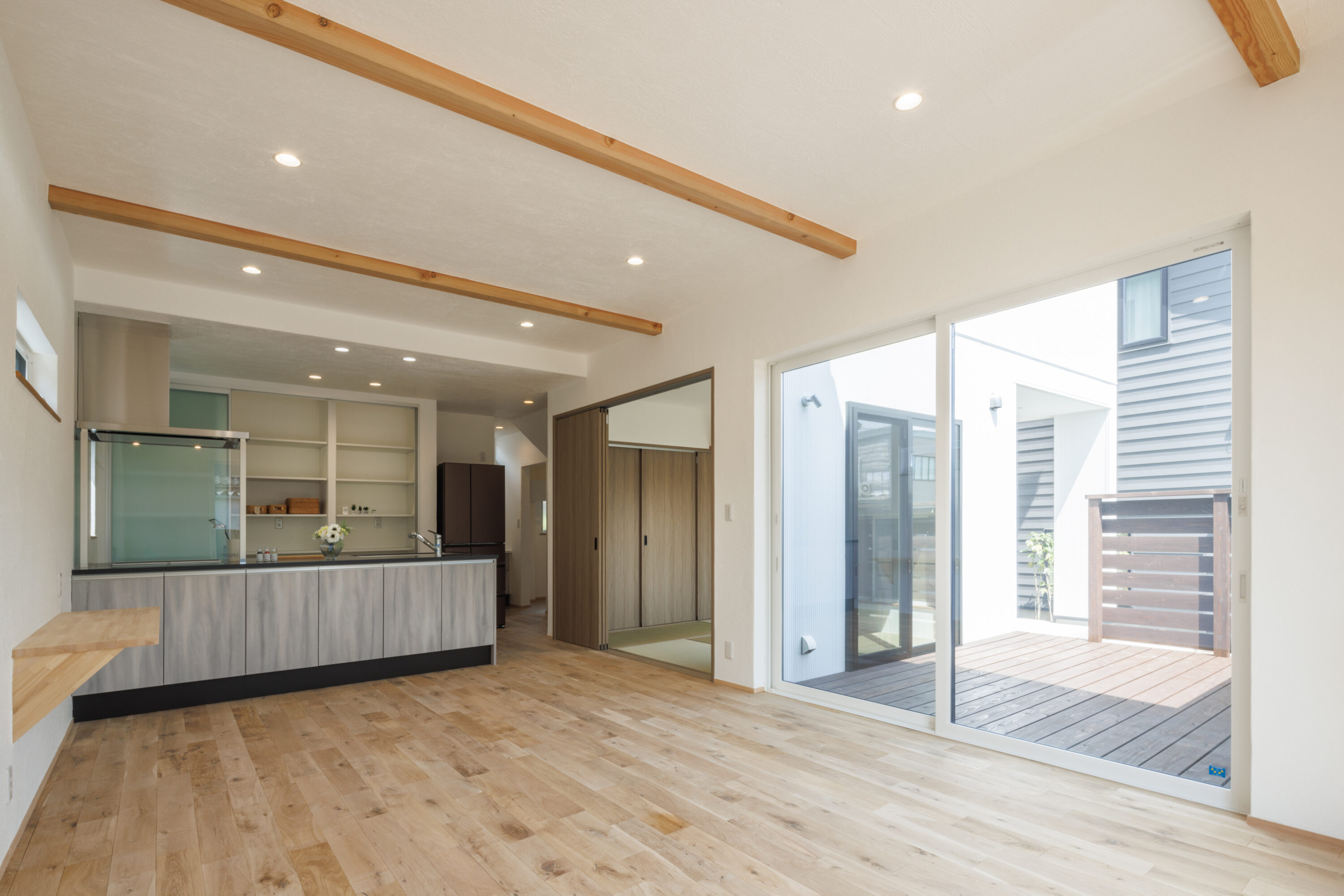 天井を2.7mと高めに設定したリビング・ダイニングは、想像以上の開放感。その先には、アウトドアリビングとしても楽しめるウッドデッキが広がり、家族の時間を豊かに彩ります。