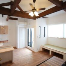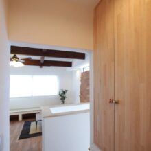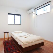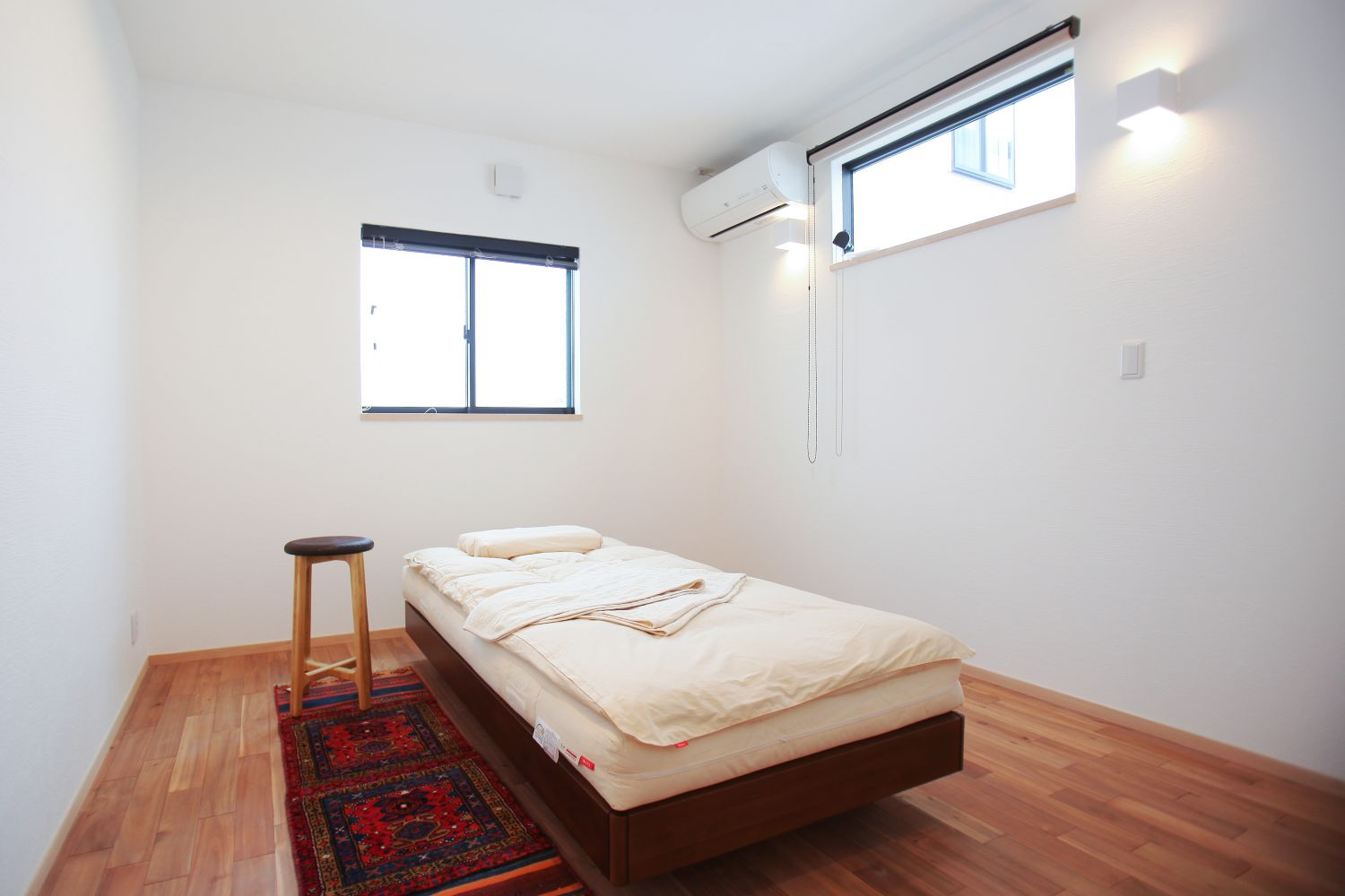 寝室には高い位置に窓を設けることで、外部からの視線を気にすることなく、太陽の光をたっぷりと取り込めるように工夫しました。併設されたウォークインクローゼットは、お持ちのタンスがぴったり収まるようにハンガーパイプや棚を配置。デッドスペースを生まず、すっきりとした収納を実現しています。各部屋の扉の色や収納の垂れ壁の形を変えるなど、使う人の個性を反映できるデザインも特徴です。住まうほどに愛着が湧き、自分だけの特別な空間を育てていく楽しみがあります。