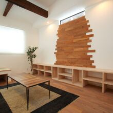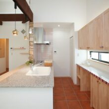 リビングの造作棚は、あえて扉を設けないことで、「見せる収納」も「隠す収納」も楽しめる自由度の高いデザインに。季節や気分に合わせて、ディスプレイを気軽に変えることができます。キッチンは、米のりと無垢材で造られたキャビネットに、鋳物ホーローのシンク、天板には天然石の御影石(ピーチポリーノ)を採用。床材のアカシアの無垢材とも相性が良く、温かみのある空間を演出しています。カウンター横の壁には、一枚一枚表情の異なる天然石を大胆にあしらい、空間のアクセントとしました。