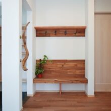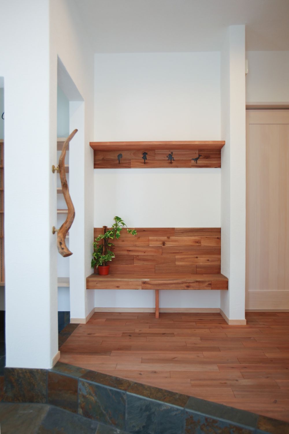 玄関にはアカシアの無垢材で造作したベンチと、ご家族分のフックを設置。外出時に必要なものを掛けておけば、忙しい朝もスムーズです。