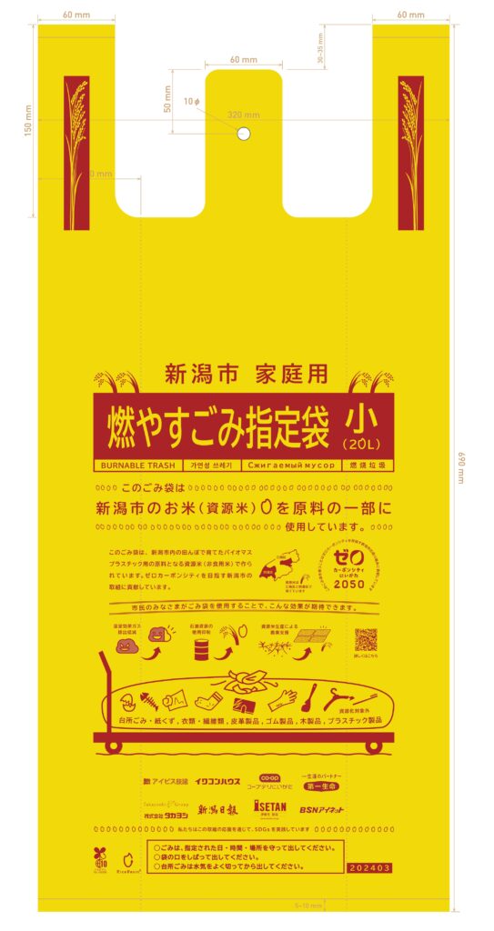 市町村内で栽培したお米を原料にした「市町村指定ごみ袋」の導入は全国初の取り組みです。
