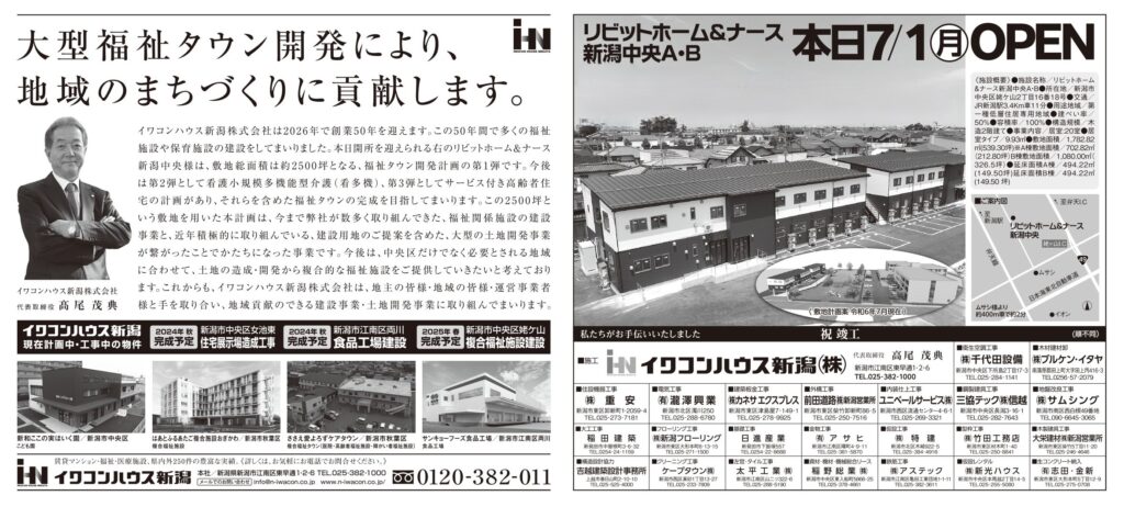 昨日2024.7.1 (月) の新潟日報朝刊に「リビットホーム&ナース新潟中央A・B」の竣工広告が掲載されました。