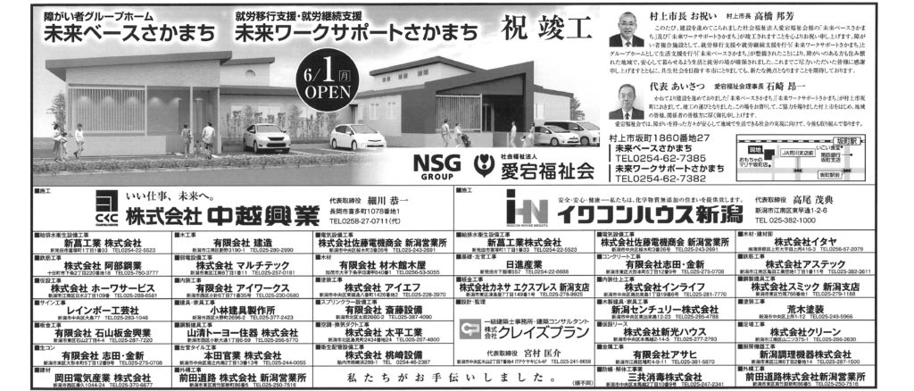 本日、弊社が施工させていただきました「未来ベースさかまち」「未来ワークサポートさかまち」の 竣工広告が新潟日報 下越版の朝刊に掲載されました。